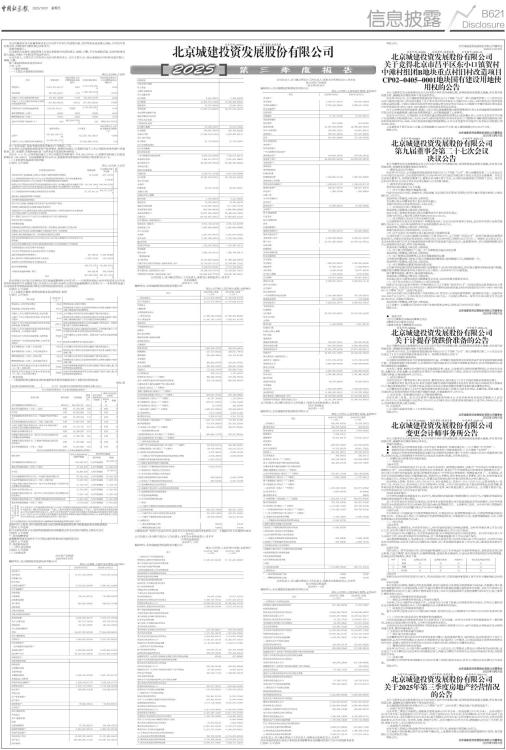 本公司董事会及全体董事保证本公告内容不存在任何虚假记载、误导性陈述或者重大遗漏,并对其内容的真实性、准确性和完整性承担法律责任。 重要内容提示: 公司董事会及董事、高级管理人员保证季度报告内容的真实、准确、完整,不存在虚假记载、误导性陈述或重大遗漏,并承担个别和连带的法律责任。 公司负责人、主管会计工作负责人及会计机构负责人(会计主管人员)保证季度报告中财务信息的真实、准确、完整。 第三季度财务报表是否经审计 □是 √否 一、主要财务数据 (一)主要会计数据和财务指标 单位:元币种:人民币 ■ 注:“本报告期”指本季度初至本季度末3个月期间,下同。 本公司在计算每股收益和净资产收益率时,按照相关规定,已扣除归属于上市公司股东的净利润中其他权益工具(永续债)的股利或利息(包括未宣告发放股利或利息)。 2025年 1-9 月,公司实现归属于上市公司股东的净利润为 764,828,507.99 元,扣除其他权益工具股息影响145,145,000.01 元后每股收益为0.2985元,扣除影响后的加权平均净资产收益率为3.22 %。 (二)非经常性损益项目和金额 √适用 □不适用 单位:元币种:人民币 ■ 对公司将《公开发行证券的公司信息披露解释性公告第1号一一非经常性损益》未列举的项目认定为非经常性损益项目且金额重大的,以及将《公开发行证券的公司信息披露解释性公告第1号一一非经常性损益》中列举的非经常性损益项目界定为经常性损益的项目,应说明原因。 □适用 √不适用 (三)主要会计数据、财务指标发生变动的情况、原因 √适用 □不适用 ■ 二、股东信息 (一)普通股股东总数和表决权恢复的优先股股东数量及前十名股东持股情况表 单位:股 ■ 持股5%以上股东、前10名股东及前10名无限售流通股股东参与转融通业务出借股份情况 □适用 √不适用 前10名股东及前10名无限售流通股股东因转融通出借/归还原因导致较上期发生变化 □适用 √不适用 三、其他提醒事项 需提醒投资者关注的关于公司报告期经营情况的其他重要信息 □适用 √不适用 四、季度财务报表 (一)审计意见类型 □适用 √不适用 (二)财务报表 合并资产负债表 2025年9月30日 编制单位:北京城建投资发展股份有限公司 单位:元币种:人民币审计类型:未经审计 ■ ■ 公司负责人:齐占峰主管会计工作负责人:邹哲会计机构负责人:肖木军 合并利润表 2025年1一9月 编制单位:北京城建投资发展股份有限公司 单位:元币种:人民币审计类型:未经审计 ■ 本期发生同一控制下企业合并的,被合并方在合并前实现的净利润为:0元, 上期被合并方实现的净利润为:0元。 公司负责人:齐占峰主管会计工作负责人:邹哲会计机构负责人:肖木军 合并现金流量表 2025年1一9月 编制单位:北京城建投资发展股份有限公司 单位:元币种:人民币审计类型:未经审计 ■ 公司负责人:齐占峰主管会计工作负责人:邹哲会计机构负责人:肖木军 母公司资产负债表 2025年9月30日 编制单位:北京城建投资发展股份有限公司 单位:元币种:人民币审计类型:未经审计 ■ 公司负责人:齐占峰主管会计工作负责人:邹哲会计机构负责人:肖木军 母公司利润表 2025年1一9月 编制单位:北京城建投资发展股份有限公司 单位:元币种:人民币审计类型:未经审计 ■ 公司负责人:齐占峰主管会计工作负责人:邹哲会计机构负责人:肖木军 母公司现金流量表 2025年1一9月 编制单位:北京城建投资发展股份有限公司 单位:元币种:人民币审计类型:未经审计 ■ 公司负责人:齐占峰主管会计工作负责人:邹哲会计机构负责人:肖木军 2025年起首次执行新会计准则或准则解释等涉及调整首次执行当年年初的财务报表 □适用 √不适用 特此公告。 北京城建投资发展股份有限公司董事会 2025年10月30日 证券代码:600266 证券简称:城建发展 公告编号:2025-52 北京城建投资发展股份有限公司 关于竞得北京市昌平区东小口镇贺村中滩村组团B地块重点村旧村改造项目CP02-0405-0001地块国有建设用地使用权的公告 本公司董事会及全体董事保证本公告内容不存在任何虚假记载、误导性陈述或者重大遗漏,并对其内容的真实性、准确性和完整性承担个别及连带责任。 2025年10月21日,北京城建投资发展股份有限公司(以下简称“公司”)第九届董事会第二十六次会议在公司六楼会议室召开,会议审议通过了关于参与北京市昌平区东小口镇CP02-0405-0001地块出让预申请及后续竞买的议案,同意公司联合其他合作伙伴或独立参与北京市昌平区东小口镇贺村中滩村组团B地块重点村旧村改造项目CP02-0405-0001地块出让预申请及后续竞买活动。 由于上述事项涉及商业秘密,根据《上市公司信息披露暂缓与豁免管理规定》及《北京城建投资发展股份有限公司信息披露暂缓与豁免业务管理制度》,公司暂缓披露了上述事项。 2025年10月30日,公司收到《北京市国有建设用地使用权挂牌出让成交确认书》,公司与北京蓝华宇房地产开发有限公司组成联合体,以280,900万元的价格竞得北京市昌平区东小口镇贺村中滩村组团B地块重点村旧村改造项目CP02-0405-0001地块国有建设用地使用权,公司与北京蓝华宇房地产开发有限公司投资比例为80%:20%。 上述地块位于昌平区东小口镇,总用地规模31342.647平方米,地上建筑规模87759.412平方米。 特此公告。 北京城建投资发展股份有限公司董事会 20