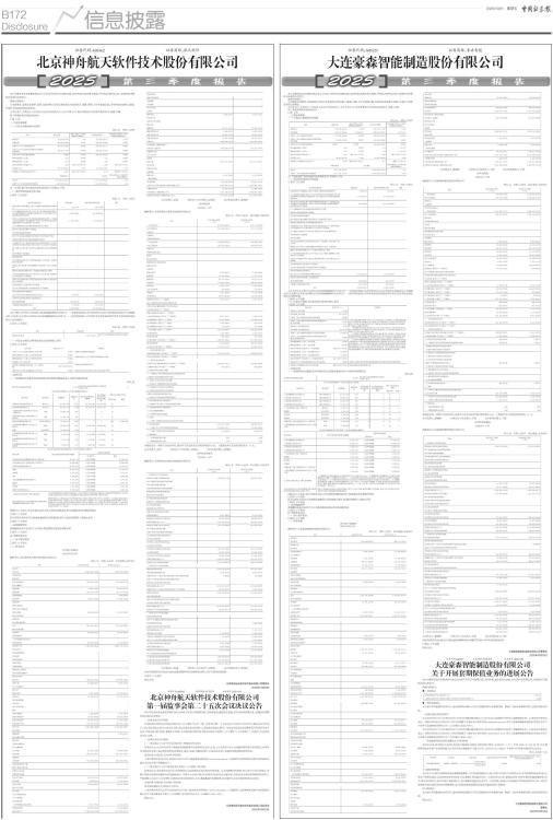 证券代码:688529 证券简称:豪森智能 本公司董事会及全体董事保证本公告内容不存在任何虚假记载、误导性陈述或者重大遗漏,并对其内容的真实性、准确性和完整性依法承担法律责任。 重要内容提示: 公司董事会及董事、高级管理人员保证季度报告内容的真实、准确、完整,不存在虚假记载、误导性陈述或重大遗漏,并承担个别和连带的法律责任。 公司负责人、主管会计工作负责人及会计机构负责人(会计主管人员)保证季度报告中财务信息的真实、准确、完整。 第三季度财务报表是否经审计 □是 √否 一、主要财务数据 (一)主要会计数据和财务指标 单位:元 币种:人民币 ■ 注:“本报告期”指本季度初至本季度末3个月期间,下同。 (二)非经常性损益项目和金额 √适用 □不适用 单位:元 币种:人民币 ■ 对公司将《公开发行证券的公司信息披露解释性公告第1号一一非经常性损益》未列举的项目认定为非经常性损益项目且金额重大的,以及将《公开发行证券的公司信息披露解释性公告第1号一一非经常性损益》中列举的非经常性损益项目界定为经常性损益的项目,应说明原因。 □适用 √不适用 (三)主要会计数据、财务指标发生变动的情况、原因 √适用 □不适用 ■ 二、股东信息 (一)普通股股东总数和表决权恢复的优先股股东数量及前十名股东持股情况表 单位:股 ■ 持股5%以上股东、前10名股东及前10名无限售流通股股东参与转融通业务出借股份情况 □适用 √不适用 前10名股东及前10名无限售流通股股东因转融通出借/归还原因导致较上期发生变化 □适用 √不适用 三、其他提醒事项 需提醒投资者关注的关于公司报告期经营情况的其他重要信息 □适用 √不适用 四、季度财务报表 (一)审计意见类型 □适用 √不适用 (二)财务报表 合并资产负债表 2025年9月30日 编制单位:大连豪森智能制造股份有限公司 单位:元 币种:人民币 审计类型:未经审计 ■ ■ 公司负责人:董德熙 主管会计工作负责人:于婷 会计机构负责人:于婷 合并利润表 2025年1一9月 编制单位:大连豪森智能制造股份有限公司 单位:元 币种:人民币 审计类型:未经审计 ■ 本期发生同一控制下企业合并的,被合并方在合并前实现的净利润为:0元, 上期被合并方实现的净利润为: 0 元。 公司负责人:董德熙 主管会计工作负责人:于婷 会计机构负责人:于婷 合并现金流量表 2025年1一9月 编制单位:大连豪森智能制造股份有限公司 单位:元 币种:人民币 审计类型:未经审计 ■ 公司负责人:董德熙 主管会计工作负责人:于婷 会计机构负责人:于婷 2025年起首次执行新会计准则或准则解释等涉及调整首次执行当年年初的财务报表 □适用 √不适用 特此公告。 大连豪森智能制造股份有限公司董事会 2025年10月30日 证券代码:688529 证券简称:豪森智能 公告编号:2025-038 大连豪森智能制造股份有限公司 关于开展套期保值业务的进展公告 本公司董事会及全体董事保证本公告内容不存在任何虚假记载、误导性陈述或者重大遗漏,并对其内容的真实性、准确性和完整性承担法律责任。 重要内容提示: ● 进展情况 ■ ● 特别风险提示 本公告中所列数据均未经审计,最终的影响金额以公司正式披露的经审计数据为准。敬请广大投资者谨慎决策,注意防范投资风险。 一、前期已履行的审议程序 公司自2023年12月11日至2024年12月10日开展金额不超过12,000.00美元或等值外币的外汇套期保值业务,上述事项已经审议通过。具体内容详见公司2023年12月12日披露于上海证券交易所官网(www.sse.com.cn)的《大连豪森智能制造股份有限公司关于开展外汇套期保值业务的公告》(公告编号:2023-075)。 公司自2024年11月19日至2025年11月18日开展金额不超过20,000.00美元或等值外币的外汇套期保值业务,上述事项已经审议通过。具体内容详见公司2024年11月21日披露于上海证券交易所官网(www.sse.com.cn)的《大连豪森智能制造股份有限公司关于开展外汇套期保值业务的公告》(公告编号:2024-029)。 二、 开展套期保值业务的进展及对公司的影响 2025年以来,各币别兑人民币汇率出现大幅波动,根据公司财务部门统计,自2025年 1 月 1 日至 2025 年 9月 30 日,外汇套期保值业务交割产生投资损益与公允价值变动损益累计亏损人民币1,268.39万元,占最近一年经审计归母净利润比例为14.43%。 单位:人民币 万元 ■ 三、风险控制措施 公司及子公司进行套期保值业务遵循稳健原则,且在批准的额度内开展,未进行以投机为目的的交易,所有套期保值业务均以正常生产经营为基础,以具体经营业务为依托,均以规避汇率风险为目的。但是2025年以来,受国际政治、经济环境等多重因素影响,美元、欧元等币种对人民币市场汇率波动较大,进行套期保值业务也会存在一定的风险,后续公司会加强对市场情况的研究分析,实时关注国际市场环境变化并适时调整策略,最大限度地降低套期保值业务可能造成的不利影响。 四、风险提示 本公告中所列数据均未经审计,最终的影响金额以公司正式披露的经审计数据为准。敬请广大投资者谨慎决策,注意防范投资风险。 特此公告。 大连豪森智能制造股份有限公司 董事会 2025年10月31日