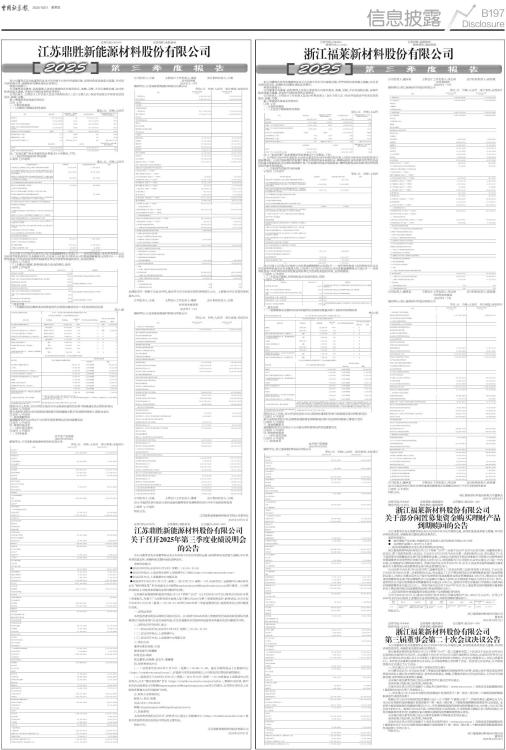 证券代码:603876 证券简称:鼎胜新材 本公司董事会及全体董事保证本公告内容不存在任何虚假记载、误导性陈述或者重大遗漏,并对其内容的真实性、准确性和完整性承担法律责任。 重要内容提示: 公司董事会及董事、高级管理人员保证季度报告内容的真实、准确、完整,不存在虚假记载、误导性陈述或重大遗漏,并承担个别和连带的法律责任。 公司负责人、主管会计工作负责人及会计机构负责人(会计主管人员)保证季度报告中财务信息的真实、准确、完整。 第三季度财务报表是否经审计 □是 √否 一、主要财务数据 (一)主要会计数据和财务指标 单位:元 币种:人民币 ■ 注:“本报告期”指本季度初至本季度末3个月期间,下同。 (二)非经常性损益项目和金额 √适用 □不适用 单位:元 币种:人民币 ■ 对公司将《公开发行证券的公司信息披露解释性公告第1号一一非经常性损益》未列举的项目认定为非经常性损益项目且金额重大的,以及将《公开发行证券的公司信息披露解释性公告第1号一一非经常性损益》中列举的非经常性损益项目界定为经常性损益的项目,应说明原因。 □适用 √不适用 (三)主要会计数据、财务指标发生变动的情况、原因 √适用 □不适用 ■ 二、股东信息 (一)普通股股东总数和表决权恢复的优先股股东数量及前十名股东持股情况表 单位:股 ■ 持股5%以上股东、前10名股东及前10名无限售流通股股东参与转融通业务出借股份情况 □适用 √不适用 前10名股东及前10名无限售流通股股东因转融通出借/归还原因导致较上期发生变化 □适用 √不适用 三、其他提醒事项 需提醒投资者关注的关于公司报告期经营情况的其他重要信息 □适用 √不适用 四、季度财务报表 (一)审计意见类型 □适用 √不适用 (二)财务报表 合并资产负债表 2025年9月30日 编制单位:江苏鼎胜新能源材料股份有限公司 单位:元 币种:人民币 审计类型:未经审计 ■ 公司负责人:王诚 主管会计工作负责人:楼清 会计机构负责人:王瑛 合并利润表 2025年1一9月 编制单位:江苏鼎胜新能源材料股份有限公司 单位:元 币种:人民币 审计类型:未经审计 ■ 本期发生同一控制下企业合并的,被合并方在合并前实现的净利润为:0元, 上期被合并方实现的净利润为:0元。 公司负责人:王诚 主管会计工作负责人:楼清 会计机构负责人:王瑛 合并现金流量表 2025年1一9月 编制单位:江苏鼎胜新能源材料股份有限公司 单位:元 币种:人民币 审计类型:未经审计 ■ 公司负责人:王诚 主管会计工作负责人:楼清 会计机构负责人:王瑛 2025年起首次执行新会计准则或准则解释等涉及调整首次执行当年年初的财务报表 □适用 √不适用 特此公告。 江苏鼎胜新能源材料股份有限公司董事会 2025年10月31日 证券代码:603876 证券简称:鼎胜新材 公告编号:2025-090 江苏鼎胜新能源材料股份有限公司 关于召开2025年第三季度业绩说明会的公告 本公司董事会及全体董事保证本公告内容不存在任何虚假记载、误导性陈述或者重大遗漏,并对其内容的真实性、准确性和完整性承担法律责任。 重要内容提示: ●会议召开时间:2025年11月18日(星期二)10:00-11:00 ●会议召开地点:上海证券交易所上证路演中心(网址:https://roadshow.sseinfo.com/) ●会议召开方式:上证路演中心网络互动 ●投资者可于2025年11月11日(星期二)至11月17日(星期一)16:00前登录上证路演中心网站首页点击“提问预征集”栏目或通过公司邮箱dingshengxincai@dingshengxincai.com进行提问。公司将在说明会上对投资者普遍关注的问题进行回答。 江苏鼎胜新能源材料股份有限公司(以下简称“公司”)已于2025年10月31日发布公司2025年第三季度报告,为便于广大投资者更全面深入地了解公司2025年第三季度经营成果、财务状况,公司计划于2025年11月18日(星期二)10:00-11:00举行2025年第三季度业绩说明会,就投资者关心的问题进行交流。 一、说明会类型 本次投资者说明会以网络互动形式召开,公司将针对2025年第三季度的经营成果及财务指标的具体情况与投资者进行互动交流和沟通,在信息披露允许的范围内就投资者普遍关注的问题进行回答。 二、说明会召开的时间、地点 (一)会议召开时间:2025年11月18日(星期二)10:00-11:00 (二)会议召开地点:上证路演中心 (三)会议召开方式:上证路演中心网络互动 三、参加人员 董事长兼总经理:王诚 董事会秘书:陈魏新 财务总监:楼清 独立董事:岳修峰、徐文学、姜姗姗 四、投资者参加方式 (一)投资者可在2025年11月18日(星期二)10:00-11:00,通过互联网登录上证路演中心(https://roadshow.sseinfo.com/),在线参与本次业绩说明会,公司将及时回答投资者的提问。 (二)投资者可于2025年11月11日(星期二)至11月17日(星期一)16:00前登录上证路演中心网站首页,点击“提问预征集”栏目(https://roadshow.sseinfo.com/preCallQa),根据活动时间,选中本次活动或通过公司邮箱dingshengxincai@dingshengxincai.com向公司提问,公司将在说明会上对投资者普遍关注的问题进行回答。 五、联系人及咨询办法 联系人:李玲、张潮 电话:0511-85580854 邮箱:dingshengxincai@dingshengxincai.com 六、其他事项 本次投资者说明会召开后,投资者可以通过上证路演中心(https://roadshow.sseinfo.com/)查看本次投资者说明会的召开情况及主要内容。 特此公告。 江苏鼎胜新能源材料股份有限公司 2025年10月31日