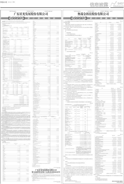 证券代码:002701 证券简称:奥瑞金 公告编号:(奥瑞)2025 - 004号 本公司及董事会全体成员保证信息披露的内容真实、准确、完整,没有虚假记载、误导性陈述或重大遗漏。 重要内容提示: 1.董事会及董事、高级管理人员保证季度报告的真实、准确、完整,不存在虚假记载、误导性陈述或重大遗漏,并承担个别和连带的法律责任。 2.公司负责人、主管会计工作负责人及会计机构负责人声明:保证季度报告中财务信息的真实、准确、完整。 3.第三季度财务会计报告是否经过审计 否。 一、主要财务数据 (一)主要会计数据和财务指标 公司是否需追溯调整或重述以前年度会计数据:否。 单位:元 ■ (二)非经常性损益项目和金额 单位:元 ■ 其他符合非经常性损益定义的损益项目的具体情况 其他符合非经常性损益定义的损益项目4.63亿元,主要系报告期内收购的原中粮包装控股有限公司(已更名为:华瑞凤泉包装控股有限公司)和兴帆有限公司于2025年1月纳入公司合并报表范围,根据会计准则的相关规定,公司原持有中粮包装控股有限公司24.4%的股权和兴帆有限公司30%的股权于购买日确认的投资收益。 公司不存在将《公开发行证券的公司信息披露解释性公告第1号一一非经常性损益》中列举的非经常性损益项目界定为经常性损益的项目的情形。 (三)主要会计数据和财务指标发生变动的情况及原因 1. 本报告期末总资产315.48亿元,较期初增加74.37%,总负债207.17亿元,较期初增加137.11%,净资产108.31亿元,较期初增加15.77%,主要系合并原中粮包装控股有限公司、兴帆有限公司和ORG UAC Company的影响,以及本期新增并购贷款,负债总额相应有所增加; 2. 年初至报告期末,营业收入183.46亿元,较上年同期增加68.97%,营业成本158.66亿元,较上年同期增加76.70%,主要系原中粮包装控股有限公司纳入合并范围所致; 3. 年初至报告期末,期间费用14.47亿元,较上年同期增加5.43亿元,主要系本期合并报表范围扩大、收购项目的中介服务费和并购贷款利息费用增加所致; 4. 年初至报告期末,投资收益5.44亿元,较上年同期增加260.10%,主要系前述非同一控制下企业合并产生的投资收益所致; 5. 年初至报告期末,归属于上市公司股东的净利润10.76亿元,较上年同期增加41.40%,主要系前述各项因素叠加影响所致; 6. 年初至报告期末,投资活动产生的现金流量净额为 -48.27亿元,上年同期为 -1.57亿元,主要系本期支付收购项目的股权对价款所致; 7. 年初至报告期末,筹资活动产生的现金流量净额为21.38亿元,上年同期为3.19亿元,主要系本期新增并购贷款所致。 二、股东信息 (一)普通股股东总数和表决权恢复的优先股股东数量及前十名股东持股情况表 单位:股 ■ 持股5%以上股东、前10名股东及前10名无限售流通股股东参与转融通业务出借股份情况 不适用。 前10名股东及前10名无限售流通股股东因转融通出借/归还原因导致较上期发生变化 不适用。 (二)公司优先股股东总数及前10名优先股股东持股情况表 不适用。 三、其他重要事项 公司于2025年8月8日、2025年8月28日召开第五届董事会2025年第三次会议及2025年第二次临时股东大会,审议通过了《关于公司符合非公开发行可交换公司债券条件的议案》、《关于公司非公开发行可交换公司债券方案的议案》、《关于提请股东大会授权董事会及其授权人士全权办理本次非公开发行可交换公司债券相关事项的议案》等相关议案。充分考虑公司的发展战略并结合公司实际情况,公司拟面向专业机构投资者非公开发行可交换公司债券。具体内容详见公司于2025年8月9日、2025年8月29日在《中国证券报》、《证券时报》、《上海证券报》、《证券日报》及巨潮资讯网(http://www.cninfo.com.cn)披露的相关公告。 四、季度财务报表 (一) 财务报表 1、合并资产负债表 编制单位:奥瑞金科技股份有限公司 2025年09月30日 单位:元 ■ 法定代表人:周云杰 主管会计工作负责人:高礼兵 会计机构负责人:高礼兵 2、合并年初到报告期末利润表 单位:元 ■ 法定代表人:周云杰 主管会计工作负责人:高礼兵 会计机构负责人:高礼兵 3、合并年初到报告期末现金流量表 单位:元 ■ 法定代表人:周云杰 主管会计工作负责人:高礼兵 会计机构负责人:高礼兵 (二)2025年起首次执行新会计准则调整首次执行当年年初财务报表相关项目情况 不适用。 (三)审计报告 第三季度财务会计报告是否经过审计 公司第三季度财务会计报告未经审计。 奥瑞金科技股份有限公司董事会 2025年10月29日