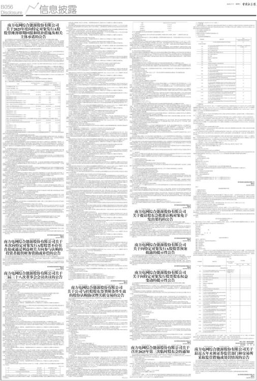 证券代码:003035 证券简称:南网能源 公告编号:2025-058 南方电网综合能源股份有限公司 关于2025年度向特定对象发行A股 股票摊薄即期回报和填补措施及相关主体承诺的公告 本公司及董事会全体成员保证信息披露内容的真实、准确和完整,没有虚假记载、误导性陈述或重大遗漏。 根据《国务院关于进一步促进资本市场健康发展的若干意见》(国发[2014]17号)、《国务院办公厅关于进一步加强资本市场中小投资者合法权益保护工作的意见》(国办发[2013]110号)以及《关于首发及再融资、重大资产重组摊薄即期回报有关事项的指导意见》(证监会公告[2015]31号)等法律法规要求,为保障中小投资者知情权,维护中小投资者利益,南方电网综合能源股份有限公司(以下简称“公司”、“南网能源”)就本次非公开发行股票对即期回报摊薄的影响进行了认真分析和计算,现将本次非公开发行股票摊薄即期回报对公司主要财务指标的影响及公司采取的填补措施公告如下: 一、本次向特定对象发行股票摊薄即期回报对公司主要财务指标的影响 (一)测算的假设条件 以下假设仅为测算本次发行摊薄即期回报对公司主要财务指标的影响,不代表对公司2025年、2026年度经营情况及趋势的判断,亦不构成盈利预测。投资者据此进行投资决策造成损失的,公司不承担赔偿责任。 1、假设公司本次发行于2026年6月30日实施完成,该完成时间仅用于计算本次发行摊薄即期回报对公司主要财务指标的影响,最终以经中国证券监督管理委员会(以下简称“中国证监会”)同意注册后实际发行完成时间为准; 2、假设宏观经济环境、产业政策、证券行业情况、产品市场情况及公司经营环境等方面没有发生重大不利变化; 3、假设本次向特定对象发行股票募集资金总额为200,000.00万元,并假设发行价为3.83元/股(即假设以2025年9月30日为定价基准日,定价基准日前20个交易日均价的80%为3.83元/股),向特定对象发行股份数量为522,193,211股(上述向特定对象发行的股份数量及募集资金总额仅为假设,最终以经中国证监会同意注册并实际发行的股份数量和募集资金总额为准); 4、根据公司披露的2025年1-6月财务报表,2025年1-6月归属于母公司所有者的净利润为21,374.32万元,扣除非经常性损益后归属于母公司所有者的净利润为21,063.81万元。 假设2025年度、2026年度扣除非经常性损益前后归属于上市公司股东的净利润分别按以下三种情况进行测算:1)2025年全年数据较2025年1-6月年化数据增长10%,2026年全年数据较2025年全年数据增长10%;2)2025年全年数据较2025年1-6月年化数据持平,2026年全年数据较2025年全年数据持平;3)2025年全年数据较2025年1-6月年化数据下降10%,2026年全年数据较2025年全年数据下降10%。该假设仅用于计算本次向特定对象发行股票摊薄即期回报对主要财务指标的影响,不代表公司对未来经营情况及趋势的判断,亦不构成公司的盈利预测,投资者不应据此进行投资决策,投资者据此进行投资决策造成损失的,公司不承担赔偿责任; 5、在预测公司期末发行在外的普通股股数时,以本次发行前截至本公告前总股本数378,787.8787万股为基础,仅考虑本次发行的影响,不考虑其他因素导致股本变动的情形; 6、未考虑其他非经常性损益、不可抗力因素对公司财务状况的影响; 7、未考虑本次发行募集资金到账后,对公司经营、财务状况(如财务费用、投资收益)等的影响。 (二)对公司主要财务指标的影响 基于上述假设前提,公司测算了本次发行摊薄即期回报对主要财务指标的影响,具体情况如下: ■ 注:基本每股收益及稀释每股收益系按照《公开发行证券的公司信息披露编报规则第9号一一净资产收益率和每股收益的计算及披露》的规定计算。 二、关于本次向特定对象发行股票摊薄即期回报的风险提示 本次发行完成后,公司的股本及净资产规模相应增加,有利于增强公司的抗风险能力和战略目标的实现。但短期内公司的营业收入及盈利能力难以同步增长,导致公司摊薄后的每股收益存在短期内下降的风险。此外,一旦前述分析的假设条件或公司经营情况发生重大变化,不能排除本次发行导致即期回报被摊薄情况发生变化的可能性。 三、关于本次发行必要性和合理性的说明 本次融资符合公司所处行业发展趋势和公司的未来发展规划,有利于提升公司的资金实力和盈利能力,通过进一步优化资本结构,增强公司抗经营风险的能力,巩固和加强公司的行业地位,符合公司及公司全体股东的利益。本次发行的必要性和可行性等相关说明详见公司编制的《南方电网综合能源股份有限公司2025年度向特定对象发行A股股票预案》之“第四节 董事会关于本次募集资金使用的可行性分析”之“二、本次募集资金使用的必要性和可行性分析”部分相关内容。 四、本次募集资金投资项目与公司现有业务的关系 公司主要从事节能服务,以“整合技术、研究政策、服务社会”为使命,以引领综合能源产业新生态为愿景,为客户能源使用提供诊断、设计、改造、综合能源项目投资及运营维护等一站式综合节能服务。本次募集资金投资项目均投向公司现有主营业务,并旨在改善公司财务状况和资本结构,降低财务风险,为公司未来的快速发展奠定基础。 五、公司实施募投项目在人员、技术、市场等方面的储备情况 本次发行募集资金扣除发行费用后将全部用于