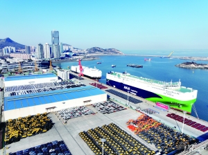 在连云港港汽车出口码头,滚装轮准备装载出口汽车。 新华社图文