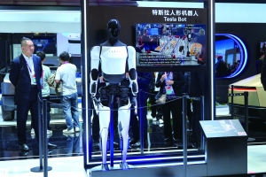 这是11月5日在第八届进博会汽车及智慧出行展区特斯拉展台拍摄的特斯拉人形机器人。11月5日,第八届中国国际进口博览会在国家会展中心(上海)开幕。