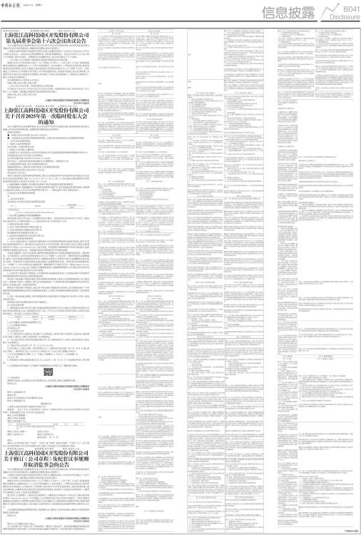 股票代码:600895 股票简称:张江高科 编号:临2025-035 上海张江高科技园区开发股份有限公司 第九届董事会第十六次会议决议公告 本公司董事会及全体董事保证本公告内容不存在任何虚假记载、误导性陈述或者重大遗漏,并对其内容的真实性、准确性和完整性承担法律责任。 上海张江高科技园区开发股份有限公司第九届董事会第十六次会议于2025年11月7日以通讯方式召开。本次会议应参加董事6名,实际参加董事6名。会议召开符合《公司法》和《公司章程》的有关规定。经董事会全体董事审议,会议审议通过了以下议案: 一、关于修订《公司章程》及配套议事规则并取消监事会的议案 根据《中华人民共和国公司法》(以下简称《公司法》)、《关于新〈公司法〉配套制度规则实施相关过渡期安排》、《上市公司章程指引(2025年修订)》等相关法律法规、规章及规范性文件的规定,结合上海张江高科技园区开发股份有限公司(以下简称“公司”)实际情况,公司拟对《公司章程》进行修订并不再设置监事会,取消监事设置,免去监事职务,由董事会审计委员会行使监事会的职权,同步修订《股东会议事规则》、《董事会议事规则》,废止《监事会议事规则》。 本议案将提交公司股东大会审议。 同意:6票,反对:0票,弃权:0票 二、关于召开2025年第一次临时股东大会的议案 公司拟定于2025年11月24日召开公司2025年第一次临时股东大会,会议将审议《关于修订〈公司章程〉及配套议事规则并取消监事会的议案》。 同意:6票,反对:0票,弃权:0票 特此公告 上海张江高科技园区开发股份有限公司董事会 2025年11月8日 股票代码:600895 股票简称:张江高科 公告编号:2025-037 上海张江高科技园区开发股份有限公司 关于召开2025年第一次临时股东大会的通知 本公司董事会及全体董事保证本公告内容不存在任何虚假记载、误导性陈述或者重大遗漏,并对其内容的真实性、准确性和完整性承担法律责任。 重要内容提示: ● 股东大会召开日期:2025年11月24日 ● 本次股东大会采用的网络投票系统:上海证券交易所股东大会网络投票系统 一、召开会议的基本情况 (一)股东大会类型和届次 2025年第一次临时股东大会 (二)股东大会召集人:董事会 (三)投票方式:本次股东大会所采用的表决方式是现场投票和网络投票相结合的方式 (四)现场会议召开的日期、时间和地点 召开的日期时间:2025年11月24日14 点30分 召开地点:上海市浦东新区碧波路699号博雅酒店一楼碧波厅AB (五)网络投票的系统、起止日期和投票时间。 网络投票系统:上海证券交易所股东大会网络投票系统 网络投票起止时间:自2025年11月24日 至2025年11月24日 采用上海证券交易所网络投票系统,通过交易系统投票平台的投票时间为股东大会召开当日的交易时间段,即9:15-9:25,9:30-11:30,13:00-15:00;通过互联网投票平台的投票时间为股东大会召开当日的9:15-15:00。 (六)融资融券、转融通、约定购回业务账户和沪股通投资者的投票程序 涉及融资融券、转融通业务、约定购回业务相关账户以及沪股通投资者的投票,应按照《上海证券交易所上市公司自律监管指引第1号 一 规范运作》等有关规定执行。 (七)涉及公开征集股东投票权 无 二、会议审议事项 本次股东大会审议议案及投票股东类型 ■ 1、各议案已披露的时间和披露媒体 该项议案已经公司九届十六次董事会审议通过,相关内容详见2025年11月8日上海证券交易所网站,《中国证券报》、《上海证券报》及《证券时报》公告。 2、特别决议议案:议案1 3、对中小投资者单独计票的议案:无 4、涉及关联股东回避表决的议案:无 应回避表决的关联股东名称:无 5、涉及优先股股东参与表决的议案:无 三、股东大会投票注意事项 (一)本公司股东通过上海证券交易所股东大会网络投票系统行使表决权的,既可以登陆交易系统投票平台(通过指定交易的证券公司交易终端)进行投票,也可以登陆互联网投票平台(网址:vote.sseinfo.com)进行投票。首次登陆互联网投票平台进行投票的,投资者需要完成股东身份认证。具体操作请见互联网投票平台网站说明。 为更好地服务广大中小投资者,确保有投票意愿的中小投资者能够及时参会、 便利投票。公司拟使用上证所信息网络有限公司(以下简称“上证信息”)提供的股东会提醒服务,委托上证信息通过智能短信等形式,根据股权登记日的股东名册主动提醒股东参会投票,向每一位投资者主动推送股东会参会邀请、议案情况等信息。投资者在收到智能短信后,可根据《上市公司股东会网络投票一键通服务用户使用手册》(链接:https://vote.sseinfo.com/i/yjt_help.pdf)的提示步骤直接投票,如遇拥堵等情况,仍可通过原有的交易系统投票平台和互联网投票平台进行投票。 (二)持有多个股东账户的股东,可行使的表决权数量是其名下全部股东账户所持相同类别普通股和相同品种优先股的数量总和。 持有多个股东账户的股东通过本所网络投票系统参与股东大会网络投票的,可以通过其任一股东账户参加。投票后,视为其全部股东账户下的相同类别普通股和相同品种优先股均已分别投出同一意见的表决票。 持有多个股东账户的股东,通过多个股东账户重复进行表决的,其全部股东账户下的相同类别普通股和相同品种优先股的表决意见,分别以各类别和品种股票的第一次投票结果为准