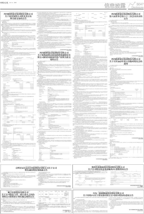 证券代码:600039 证券简称:四川路桥 公告编号:2025-116 四川路桥建设集团股份有限公司 关于放弃参股公司优先受让权 暨关联交易的公告 本公司董事会及全体董事保证本公告内容不存在任何虚假记载、误导性陈述或者重大遗漏,并对其内容的真实性、准确性和完整性承担法律责任。 重要内容提示: ●交易简要内容 四川路桥建设集团股份有限公司(以下简称公司或四川路桥)持有四川蜀道清洁能源集团有限公司(以下简称蜀道清洁能源)40%股权,公司控股股东蜀道投资集团有限责任公司(以下简称蜀道集团)持有蜀道清洁能源60%股权,蜀道清洁能源系公司的参股公司。现蜀道集团拟将其持有的蜀道清洁能源60%股权转让给公司关联方成都市新筑路桥机械股份有限公司(以下简称新筑股份),交易作价为581,352.18万元。公司拟放弃前述转让的优先受让权。 ●本次交易构成关联交易。 蜀道集团为公司控股股东,新筑股份、蜀道清洁能源为蜀道集团的控股子公司,本次交易构成关联交易。 ●本次交易不构成重大资产重组。 ●本次交易尚需提交公司股东会审议批准。 ●至本次关联交易为止(不含本次关联交易),除已提交股东会审议的关联交易外,过去12个月内,公司与蜀道集团及其下属企业发生的关联交易累计次数为10次、金额合计22.015亿元,与不同关联人进行的交易类别相关的交易的累计次数为0次。 ●本次交易不会导致公司合并报表范围发生变化,亦不会对公司财务状况和经营成果产生重大不利影响。 一、关联交易概述 (一)本次交易的基本情况 1、本次交易概况 基于蜀道清洁能源的发展规划,其控股股东蜀道集团拟将持有的蜀道清洁能源60%股权转让给公司关联方新筑股份,交易定价系根据四川天健华衡资产评估有限公司出具并经四川省国资委备案的评估报告(川华衡评报〔2025〕251号),由蜀道集团、新筑股份协商确认。蜀道清洁能源60%股权的交易作价确认为581,352.18万元,其中新筑股份现金支付119,000.00万元,其余全部以新筑股份发行股份方式支付。蜀道集团与新筑股份分别于2025年6月9日、2025年11月7日签署了《成都市新筑路桥机械股份有限公司与蜀道投资集团有限责任公司之发行股份及支付现金购买资产协议》《关于〈成都市新筑路桥机械股份有限公司与蜀道投资集团有限责任公司之发行股份及支付现金购买资产协议〉的补充协议》。公司持有蜀道清洁能源40%股权,拟放弃前述转让的优先受让权。 2、本次交易的交易要素 ■ (二)董事会审议表决情况 2025年11月7日,公司以现场结合通讯方式召开第八届董事会第六十三次会议,审议通过了《关于放弃清洁能源集团优先受让权的关联交易议案》,关联董事孙立成、池祥成回避了该议案的表决,非关联董事一致同意该议案,表决结果:8票赞成,0票反对,0票弃权。 (三)交易生效尚需履行的审批及其他程序 本次交易尚需提交公司股东会审议批准。 此外,新筑股份发行股份及支付现金购买蜀道清洁能源60%股权构成新筑股份重大资产重组,尚需新筑股份股东大会批准、四川省国资委批准、深圳证券交易所审核通过和中国证券监督管理委员会同意注册等审批事项。 至本次关联交易为止,过去12个月内公司与同一关联人或与不同关联人之间交易类别相关的关联交易已达到3,000万元以上,且已达到公司最近一期经审计净资产绝对值5%以上,本次关联交易尚需提交公司股东会审议。 二、交易对方(含关联人)情况介绍 (一)交易买方简要情况 ■ (二)交易对方的基本情况 ■ 新筑股份为公司控股股东蜀道集团的控股子公司,其关联关系符合《股票上市规则》中6.3.3条第二款第(二)项的规定。 除上述关联关系外,新筑股份与公司不存在其他产权、业务、资产、债权债务、人员等方面的关系,且新筑股份资信情况良好,未被列为失信被执行人。 截至本公告披露日,新筑股份主要从事轨道交通业务、桥梁功能部件和光伏发电,为深圳证券交易所上市公司,股票代码为“002480.SZ”。 新筑股份的主要财务数据如下: 单位:万元 ■ 三、关联交易标的基本情况 (一)交易标的概况 1、交易标的基本情况 本次交易系公司放弃参股公司蜀道清洁能源60%股权的优先受让权。 2、交易标的的权属情况 截至本公告日,蜀道清洁能源产权清晰,不存在抵押、质押及其他任何限制转让的情况,不涉及重大诉讼、仲裁事项,不涉及查封、冻结等司法措施,不存在妨碍权属转移的其他情况。 3、相关资产的运营情况 蜀道清洁能源主营水电、风电、光伏等清洁能源项目的投资、建设与运营,截至本公告日,蜀道清洁能源经营正常。 4、交易标的具体信息 (1)基本信息 ■ (2)股权结构 本次交易前股权结构: 单位:万元 ■ 本次交易后股权结构: 单位:万元 ■ (3)其他信息 本次交易前,蜀道清洁能源股东为四川路桥、蜀道集团;除公司外,不涉及有优先受让权的其他股东放弃优先受让权。 此外,蜀道清洁能源亦非失信被执行人。 (二)交易标的主要财务信息 单位:万元 ■ 四、交易标的的评估、定价情况 (一)定价情况及依据 1、本次交易的定价方法和结果 本次交易采用资产基础法对蜀道清洁能源的股东全部权益价值进行评估。根据四川天健华衡资产评估有限公司出具并经四川省国资委备案的(川华衡评报〔2025〕251号),以2025年5月31日为基准日,蜀道清洁能源的股东全部权益价值为892,663.65万