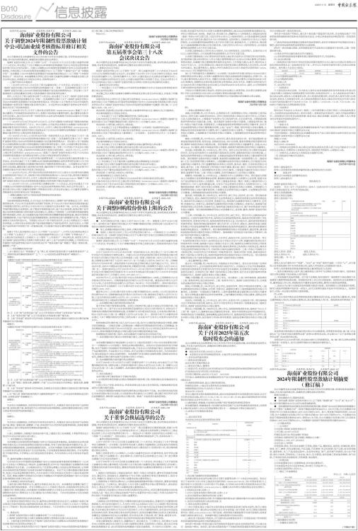 海南矿业股份有限公司 关于调整2024年限制性股票激励计划中公司层面业绩考核指标并修订相关文件的公告 |