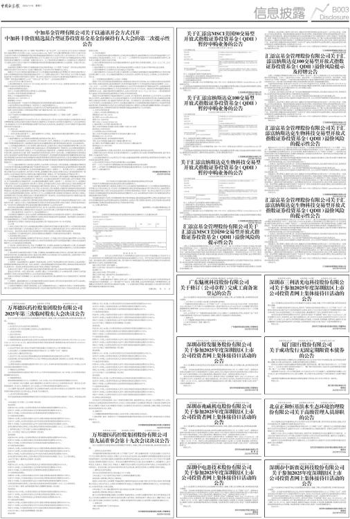 公告送出日期:2025年11月18日 1公告基本信息 ■ 注:1、本基金场内简称为美国50ETF。 2、本基金暂停上述业务期间,其他业务仍照常办理。 3、本基金恢复申购业务的具体时间将另行公告。 2 其他需要提示的事项 投资者可以通过拨打本公司客服热线(400-888-9918)或登录本公司网站(www.99fund.com)获取相关信息。 汇添富基金高度重视投资者服务和投资者教育,特此提醒投资者需正确认知基金投资的风险和长期收益,做理性的基金投资人,做明白的基金投资人,享受长期投资的快乐! 特此公告。 汇添富基金管理股份有限公司 2025年11月18日 关于汇添富纳斯达克100交易型 开放式指数证券投资基金(QDII) 暂停申购业务的公告 公告送出日期:2025年11月18日 1公告基本信息 ■ 注:1、本基金场内简称为纳指100ETF。 2、本基金暂停上述业务期间,其他业务仍照常办理。 3、本基金恢复申购业务的具体时间将另行公告。 2 其他需要提示的事项 投资者可以通过拨打本公司客服热线(400-888-9918)或登录本公司网站(www.99fund.com)获取相关信息。 汇添富基金高度重视投资者服务和投资者教育,特此提醒投资者需正确认知基金投资的风险和长期收益,做理性的基金投资人,做明白的基金投资人,享受长期投资的快乐! 特此公告。 汇添富基金管理股份有限公司 2025年11月18日 关于汇添富纳斯达克生物科技交易型开放式指数证券投资基金(QDII) 暂停申购业务的公告 公告送出日期:2025年11月18日 1公告基本信息 ■ 注:1、本基金扩位证券简称为纳指生物科技ETF。 2、本基金暂停上述业务期间,其他业务仍照常办理。 3、本基金恢复申购业务的具体时间将另行公告。 2 其他需要提示的事项 投资者可以通过拨打本公司客服热线(400-888-9918)或登录本公司网站(www.99fund.com)获取相关信息。 汇添富基金高度重视投资者服务和投资者教育,特此提醒投资者需正确认知基金投资的风险和长期收益,做理性的基金投资人,做明白的基金投资人,享受长期投资的快乐! 特此公告。 汇添富基金管理股份有限公司 2025年11月18日 汇添富基金管理股份有限公司关于 汇添富MSCI美国50交易型开放式指数证券投资基金(QDII)溢价风险的提示性公告 近期,汇添富基金管理股份有限公司(以下简称“本公司”)旗下汇添富MSCI美国50交易型开放式指数证券投资基金(QDII)(基金代码:159577,基金简称:汇添富MSCI美国50ETF,场内简称:美国50ETF;以下简称“本基金”)二级市场交易价格明显高于基金份额参考净值,出现较大幅度溢价。特此提示投资者关注二级市场交易价格溢价风险,投资者如果盲目投资,可能遭受损失。若本基金2025年11月18日二级市场交易价格溢价幅度未有效回落,本基金有权通过向深圳证券交易所申请盘中临时停牌、延长停牌时间的方式,向市场警示风险。 为保护投资者利益,本公司特向投资者提示如下: 1、本基金二级市场的交易价格,除了有基金份额净值变化的风险外,还会受到市场供求关系、系统性风险、流动性风险等其他因素的影响,可能使投资者面临损失。 2、截至目前,本基金运作正常。本公司仍将严格按照法律法规及基金合同进行投资运作。 3、截至目前,本基金无其他应披露而未披露的重大信息。本公司仍将严格按照有关规定和要求,及时做好信息披露工作。 风险提示:基金管理人承诺以诚实信用、勤勉尽责的原则管理和运用基金资产,但不保证基金一定盈利,也不保证最低收益。销售机构根据法规要求对投资者类别、风险承受能力和基金的风险等级进行划分,并提出适当性匹配意见。投资者在投资基金前应认真阅读基金合同、招募说明书(更新)和基金产品资料概要(更新)等基金信息披露文件,全面认识基金产品的风险收益特征,在了解产品情况及销售机构适当性意见的基础上,根据自身的风险承受能力、投资期限和投资目标,对基金投资作出独立决策,选择合适的基金产品。基金管理人提醒投资者基金投资的“买者自负”原则,在投资者作出投资决策后,基金运营状况与基金净值变化引致的投资风险,由投资者自行负责。 投资者可以通过拨打本公司客服热线(400-888-9918)或登录本公司网站(www.99fund.com)咨询本基金相关信息。 汇添富基金管理股份有限公司 2025年11月18日 汇添富基金管理股份有限公司关于汇添富纳斯达克100交易型开放式指数证券投资基金(QDII)溢价风险提示及停牌公告 近期,汇添富基金管理股份有限公司(以下简称“本公司”)旗下汇添富纳斯达克100交易型开放式指数证券投资基金(QDII)(基金代码:159660,基金简称:汇添富纳斯达克100ETF,场内简称:纳指100ETF;以下简称“本基金”)二级市场交易价格明显高于基金份额参考净值,出现较大幅度溢价。特此提示投资者关注二级市场交易价格溢价风险,投资者如果盲目投资,可能遭受重大损失。 为保护投资者利益,本基金将于2025年11月18日开市起至当日10:30停牌,自2025年11月18日10:30复牌。若本基金2025年11月18日二级市场交易价格溢价幅度未有效回落,本基金有权通过向深圳证券交易所申请盘中临时停牌、延长停牌时间的方式,向市场警示风险。 本公司特向投资者提示如下: 1、本基金二级市场的交易价格,除了有基金份额净值变化的风险外,还会受到市场供求关系、系统性风险、流动性风险等其他因素的影响,可能使投资者面临损失。 2、截至目前,本基金运作正常。本公司仍将严