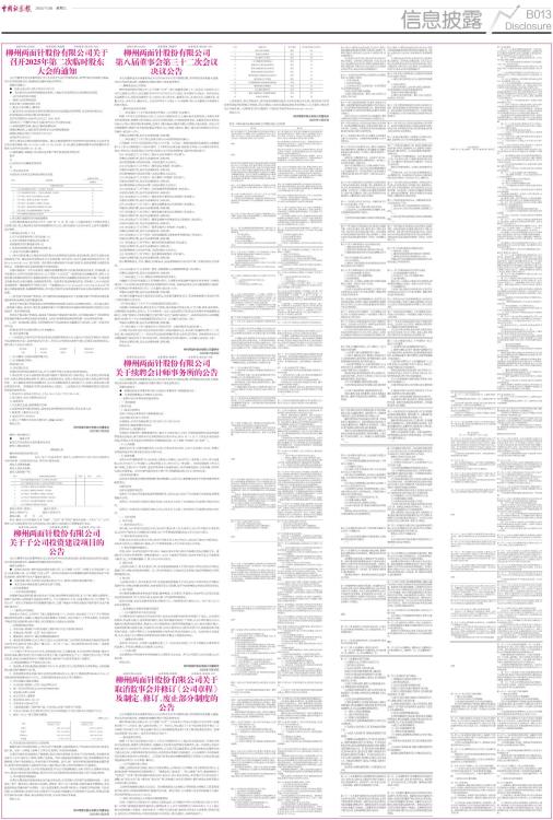 证券代码:600249 证券简称:两面针 公告编号:临2025-040 柳州两面针股份有限公司关于召开2025年第二次临时股东 大会的通知 本公司董事会及全体董事保证本公告内容不存在任何虚假记载、误导性陈述或者重大遗漏,并对其内容的真实性、准确性和完整性承担法律责任。 重要内容提示: ● 股东大会召开日期:2025年12月12日 ● 本次股东大会采用的网络投票系统:上海证券交易所股东大会网络投票系统 一、召开会议的基本情况 (一)股东大会类型和届次 2025年第二次临时股东大会 (二)股东大会召集人:董事会 (三)投票方式:本次股东大会所采用的表决方式是现场投票和网络 投票相结合的方式 (四)现场会议召开的日期、时间和地点 召开的日期时间:2025年12月12日 10点 00分 召开地点:广西柳州市东环大道282号本公司五楼会议室 (五)网络投票的系统、起止日期和投票时间。 网络投票系统:上海证券交易所股东大会网络投票系统 网络投票起止时间:自2025年12月12日 至2025年12月12日 采用上海证券交易所网络投票系统,通过交易系统投票平台的投票时间为股东大会召开当日的交易时间段,即9:15-9:25,9:30-11:30,13:00-15:00;通过互联网投票平台的投票时间为股东大会召开当日的9:15-15:00。 (六)融资融券、转融通、约定购回业务账户和沪股通投资者的投票 程序 无 (七)涉及公开征集股东投票权 无 二、会议审议事项 本次股东大会审议议案及投票股东类型 ■ 1、各议案已披露的时间和披露媒体 上述议案的具体内容详见公司于 2025 年 11 月 26 日在《上海证券报》《中国证券报》《证券日报》及上海证券交易所网站披露的相关公告,或详见股东大会召开前在上述平台披露的会议资料。 2、特别决议议案:1、3、4 3、对中小投资者单独计票的议案:7、8 4、涉及关联股东回避表决的议案:无 应回避表决的关联股东名称:无 5、涉及优先股股东参与表决的议案:无 三、股东大会投票注意事项 (一)本公司股东通过上海证券交易所股东大会网络投票系统行使表决权的,既可以登陆交易系统投票平台(通过指定交易的证券公司交易终端)进行投票,也可以登陆互联网投票平台(网址:vote.sseinfo.com)进行投票。首次登陆互联网投票平台进行投票的,投资者需要完成股东身份认证。具体操作请见互联网投票平台网站说明。 为更好地服务广大中小投资者,确保有投票意愿的中小投资者能够及时参会、便利投票,公司拟使用上证所信息网络有限公司(以下简称“上证信息”)提供的股东会提醒服务,委托上证信息通过智能短信等形式,根据股权登记日的股东名册主动提醒股东参会投票,向每一位投资者主动推送股东会参会邀请、议案情况等信息。投资者在收到智能短信后,可根据《上市公司股东会网络投票一键通服务用户使用手册》(下载链接https://vote.sseinfo.com/i/yjt_help.pdf)的提示步骤直接投票,如遇拥堵等情况,仍可通过原有的交易系统投票平台和互联网投票平台进行投票。 (二)持有多个股东账户的股东,可行使的表决权数量是其名下全部股东账户所持相同类别普通股和相同品种优先股的数量总和。 持有多个股东账户的股东通过本所网络投票系统参与股东大会网络投票的,可以通过其任一股东账户参加。投票后,视为其全部股东账户下的相同类别普通股和相同品种优先股均已分别投出同一意见的表决票。 持有多个股东账户的股东,通过多个股东账户重复进行表决的,其全部股东账户下的相同类别普通股和相同品种优先股的表决意见,分别以各类别和品种股票的第一次投票结果为准。 (三)同一表决权通过现场、本所网络投票平台或其他方式重复进行表决的,以第一次投票结果为准。 (四)股东对所有议案均表决完毕才能提交。 四、会议出席对象 (一)股权登记日收市后在中国证券登记结算有限责任公司上海分公司登记在册的公司股东有权出席股东大会(具体情况详见下表),并可以以书面形式委托代理人出席会议和参加表决。该代理人不必是公司股东。 ■ (二)公司董事、监事和高级管理人员。 (三)公司聘请的律师。 (四)其他人员 五、会议登记方法 全体股东均有权出席股东大会,并可以委托代理人出席会议和参加表决。 1、登记手续 社会公众股股东登记时须提供下列相关文件:持股凭证、本人身份证原件和复印件;代理人持股东授权委托书、委托人有效持股凭证、委托人身份证及代理人身份证原件和复印件。 法人股股东持营业执照复印件、法人代表授权委托书、股东帐户卡、出席人身份证到公司办理登记手续。 异地股东可用信函或传真方式登记。 上述登记办法不影响股权登记日登记在册股东的参会权利。 2、登记时间 2025年12月5日,上午9:00-12:00,下午2:30-5:00 3、登记地点:本公司董事会办公室 六、其他事项 1、与会股东交通、食宿等费用自理 2、如发传真进行登记的股东,请在参会时携带授权书等原件,转交会务人员 3、联系部门:董事会办公室 4、电话:0772-2506159 5、地址:广西柳州市东环大道282号,邮编:545006 特此公告。 柳州两面针股份有限公司董事会 2025年11月26日 附件1:授权委托书 ● 报备文件 提议召开本次股东大会的董事会决议 附件1:授权委托书 授权委托书 柳州两面针股份有限公司: 兹委托 先生(女士)代表本单位(或本人)出席2025年12月12日召开的贵公司2025年第二次临时股东大会,并代为行使表决
