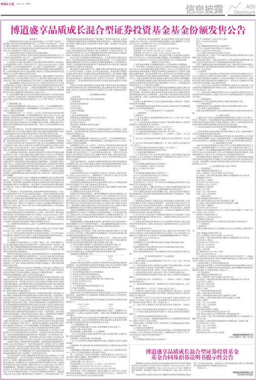 重要提示 1、博道盛享品质成长混合型证券投资基金(以下简称“本基金”)的募集已获中国证券监督管理委员会(以下简称“中国证监会”)证监许可【2025】2058号文予以注册。中国证监会对本基金募集的注册并不代表中国证监会对本基金的投资价值和市场前景作出实质性判断或保证,也不表明投资于本基金没有风险。 2、本基金是契约型开放式混合型证券投资基金。 3、本基金的基金管理人和登记机构为博道基金管理有限公司(以下使用全称或其简称“本公司”),基金托管人为招商银行股份有限公司(以下使用全称或其简称“招商银行”)。 4、投资者可以通过基金管理人的直销机构即基金管理人直销柜台以及基金管理人的网上直销交易平台(网址:www.bdfund.cn)和除基金管理人之外的其他销售机构(以下或称“其他销售机构”)认购本基金。本公告中如无特别说明,销售机构即指直销机构和其他销售机构。具体销售机构名单详见基金管理人网站公示的基金销售机构名录或拨打本公司客户服务电话进行咨询。 基金管理人可根据有关法律法规的要求,选择/调整符合要求的机构销售本基金,并在基金管理人网站公示。除法律法规或中国证监会另有规定外,任何与基金份额发售有关的当事人不得提前发售基金份额。 5、基金募集期:本基金自2025年12月1日起至2026年2月27日止通过销售机构公开发售(具体业务办理时间见各销售机构的相关业务公告或拨打客户服务电话咨询)。本基金的募集期限不超过3个月,自基金份额开始发售之日起计算。本公司也可根据基金销售情况在募集期限内适当延长或缩短基金发售时间,并及时公告。 6、本基金募集对象为符合法律法规规定的可投资于证券投资基金的个人投资者、机构投资者、合格境外投资者以及法律法规或中国证监会允许购买证券投资基金的其他投资人(以下合称“投资人”或“投资者”)。 7、募集规模上限: 本基金初始募集规模上限为30亿元人民币(不包括募集期利息,下同)。本基金募集过程中,募集规模接近、达到或超过30亿元人民币,本基金可提前结束募集。 在募集期内任何一日(含首日),若当日日终的有效认购申请全部确认后,本基金募集规模(不包括募集期利息)超过30亿元人民币,基金管理人将采取末日比例确认的方式实现规模的有效控制,并提前结束募集,即自该日的次日(含)起不再接受认购申请。当发生末日比例确认时,基金管理人将及时公告比例确认情况与结果。未确认部分的认购款项将在募集期结束后退还给投资者,由此产生的利息等损失由投资者自行承担。 当发生部分确认时,投资者认购费率按照单笔认购申请金额所对应的费率计算,末日认购申请确认金额不受认购最低限额的限制。最终认购申请确认结果以本基金登记机构的计算并确认的结果为准。 8、投资人认购本基金时,须开立本基金登记机构提供的基金账户。本基金份额发售期内各销售机构同时为投资者办理开立基金账户的手续。除法律法规另有规定外,一个投资人只能开设和使用一个基金账户。不得非法利用他人账户或资金进行认购,也不得违规融资或帮助他人违规进行认购。投资人应保证用于认购的资金来源合法,投资人应有权自行支配,不存在任何法律上、合约上或其他障碍。投资人不得使用贷款、发行债券等筹集的非自有资金投资本基金。 9、认购限额:基金管理人直销柜台接受首次认购申请的最低金额为单笔100,000元,追加认购的最低金额为单笔10,000元;已在直销机构有认购或申购过本基金管理人管理的其他基金记录的投资人不受首次认购最低金额的限制。通过基金管理人网上直销交易平台办理基金认购业务的不受直销柜台单笔认购最低金额的限制,认购最低金额为单笔1.00元。本基金直销机构单笔认购最低金额可由基金管理人酌情调整。其他销售机构接受认购申请的最低金额为单笔1.00元,如果销售机构业务规则规定的最低单笔认购金额高于1.00元,以该销售机构的规定为准(以上金额均含认购费)。投资人在募集期内可以多次认购基金份额,认购费用按每笔认购申请单独计算,认购申请一经登记机构受理不得撤销。 如本基金单个投资人累计认购的基金份额数超过基金认购总份额的50%,基金管理人可以采取比例确认等方式对该投资人的认购申请进行限制。基金管理人接受某笔或者某些认购申请有可能导致投资者变相规避前述50%比例要求的,基金管理人有权拒绝该等全部或者部分认购申请。投资人认购的基金份额数以基金合同生效后登记机构的确认为准。 10、销售网点(指直销机构和/或其他销售机构的销售网点)对认购申请的受理并不表示对该申请的成功确认,而仅代表销售网点接收到认购申请。申请的成功确认应以基金合同生效后、登记机构的确认登记为准。对于认购申请及认购份额的确认情况,投资人应及时查询并妥善行使合法权利。投资人可以在基金合同生效后到原认购网点打印认购成交确认凭证。投资人可以通过本公司网站,或者致电博道基金客户服务中心(400-085-2888)进行电子对账单等邮件服务、以及净值短信等短信服务的订制。 11、本公告于2025年11月28日在《中国证券报》上刊登,其仅对本基金基金份额发售的有关事项和规定予以说明。投资者欲了解本基金的详细情况,请详细阅读刊登在本公司网站(www.bdfund.cn)和