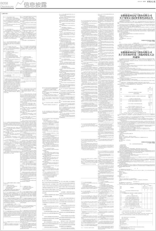 ■ ■ ■ ■ ■ ■ 证券代码:002005 证券简称:ST德豪 编号:2025一63 安徽德豪润达电气股份有限公司 关于变更公司证券事务代表的公告 本公司及董事会全体成员保证信息披露的内容真实、准确、完整,没有虚假记载、误导性陈述或重大遗漏。 一、公司证券事务代表变更概述 安徽德豪润达电气股份有限公司(以下简称“公司”)原证券事务代表杨志新先生因工作变动原因不再担任公司证券事务代表职务,董事会对杨志新先生在履职期间勤勉尽职及为公司发展所做出的贡献表示衷心感谢! 公司于2025年12月3日召开第八届董事会第十二次会议,审议通过《关于变更公司证券事务代表的议案》,董事会同意聘任李俊瑶女士为公司证券事务代表,协助董事会秘书履行职责。任期自公司第八届董事会第十二次会议审议通过之日起至公司第八届董事会任期届满之日止。 李俊瑶女士(简历附后)已取得深圳证券交易所颁发的董事会秘书资格证书,具备担任公司证券事务代表所必需的专业知识和工作经验。 截至公告披露日,李俊瑶女士未直接持有公司股票,与公司持股5%以上股东以及公司董事、监事、高级管理人员不存在关联关系;未受过中国证监会、证券交易所及其他有关部门处罚和惩戒,不属于最高人民法院公布的失信被执行人,任职资格符合有关法律、行政法规、部门规章、规范性文件等要求,公司董事会同意聘任李俊瑶女士为公司证券事务代表。 二、公司证券事务代表联系方式 联系地址:安徽省蚌埠市高新区燕南路1308号蚌埠德豪光电科技园会议室 联系电话:0756-3390188 传真:0756-3390238 电子邮箱:dehaorunda@electech.com.cn 三、备查文件 1、第八届董事会第十二次会议决议; 特此公告。 安徽德豪润达电气股份有限公司董事会 二○二五年十二月四日 附件: 李俊瑶女士简历 李俊瑶,女,1988年出生,中国国籍,无境外永久居留权,天津大学毕业,硕士研究生学历,已取得深圳证券交易所颁发的上市公司董事会秘书培训证书。历任建霖家居董事会办公室证券事务专员、小多金服合规咨询部高级经理等。2025年8月入职公司,任职公司董事会秘书办公室副总经理。 截至公告披露日,李俊瑶女士未直接持有公司股票,与公司持股5%以上股东以及公司董事、监事、高级管理人员不存在关联关系;未受过中国证监会、证券交易所及其他有关部门处罚和惩戒,不属于最高人民法院公布的失信被执行人,任职资格符合有关法律、行政法规、部门规章、规范性文件等要求。 证券代码:002005 证券简称:ST德豪 编号:2025一64 安徽德豪润达电气股份有限公司 关于召开2025年第三次临时股东大会的通知 本公司及董事会全体成员保证信息披露的内容真实、准确、完整,没有虚假记载、误导性陈述或重大遗漏。 安徽德豪润达电气股份有限公司(以下简称“公司”)于2025年12月3日召开第八届董事会第十二次会议,审议通过《关于召开2025年第三次临时股东大会的议案》,公司决定召开2025年第三次临时股东大会。现将本次会议的有关事项公告如下: 一、会议基本情况 (一)会议届次:2025年第三次临时股东大会。 (二)会议召集人:公司董事会。 (三)会议召开的合法、合规性:本次股东大会会议召开符合有关法律、行政法规、部门规章、规范性文件、《深圳证券交易所股票上市规则》和《公司章程》等的规定。 (四)会议召开的日期、时间: 1、现场会议召开时间:2025年12月19日(星期五)下午14∶00。 2、网络投票时间:通过深圳证券交易所交易系统进行网络投票的具体时间为2025年12月19日上午9:15-9:25,9:30-11:30,下午13:00-15:00;通过深圳证券交易所互联网投票系统投票的具体时间为:2025年12月19日9:15至15:00期间的任意时间。 (五)会议召开方式:现场投票与网络投票相结合的方式。 公司将通过深圳证券交易所交易系统和互联网投票系统向公司股东提供网络形式的投票平台,股东可以在网络投票时间内通过上述系统行使表决权。同一表决权只能选择现场投票、网络投票或其他表决方式的一种。同一表决权出现重复表决的以第一次投票结果为准。 (六)股权登记日为2025年12月15日。 (七)出席对象: 1、截至2025年12月15日下午15∶00交易结束后在中国证券登记结算有限责任公司深圳分公司登记在册的本公司全体股东均有权出席股东大会; 2、本公司董事、监事、高级管理人员、聘请的见证律师; 3、因故不能出席本次会议的股东,可以以书面形式委托代理人出席会议和参加表决,该代理人不必是公司的股东。 (八)现场会议地点:广东省珠海市香洲区人民西路663号泰盈汇盈中心14层公司会议室。 (九)投票规则:同一表决权只能选择现场投票、深圳证券交易所交易系统投票、深圳证券交易所互联网系统投票中的一种。同一表决权出现重复表决的以第一次投票结果为准。 二、会议审议事项 1、本次股东大会提案编码表: ■ 2、上述议案已经公司第八届董事会第十二次会议审议通过,具体内容详见公司于2025年12月4日在《中国证券报》、《证券时报》、《上海证券报》、《证券日报》及巨潮资讯网(www.cninfo.com.cn)上披露的相关公告。 3、上述议案1.00项下的第1.01、1.02、1.03子议案以及议案2.00项下的第2.06子议案为特别决议事项,须经出席股东大会的股东(包括股东代理人)所持有效表决权的三分之二以上通过。 4、上述所有议案为影响中小投资者利益的重