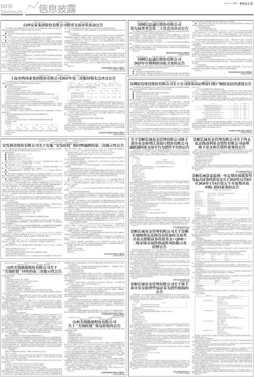 证券代码:600131 证券简称:国网信通 公告编号:2025-056号 国网信息通信股份有限公司 第九届董事会第二十次会议决议公告 本公司董事会及全体董事保证本公告内容不存在任何虚假记载、误导性陈述或者重大遗漏,并对其内容的真实性、准确性和完整性承担法律责任。 公司董事会于2025年11月27日向各位董事发出了召开第九届董事会第二十次会议的通知和会议资料,公司第九届董事会第二十次会议于2025年12月3日以通讯方式召开,会议应表决董事11名,实际表决董事11名,会议的召开符合《公司法》《公司章程》和《公司董事会议事规则》的有关规定,审议了如下议案: 一、11票同意,0票反对,0票弃权,审议通过了《公司2025年中期利润分配方案的议案》。 公司董事会认为,公司2025年中期利润分配方案是在综合考虑公司持续发展目标、盈利能力,兼顾股东合理回报基础上,结合公司所处行业特点、经营模式等作出的利润分配安排,同意公司2025年中期利润分配方案。 特此公告。 国网信息通信股份有限公司董事会 2025年12月4日 证券代码:600131 证券简称:国网信通 公告编号:2025-057号 国网信息通信股份有限公司 2025年中期利润分配方案的公告 本公司董事会及全体董事保证本公告内容不存在任何虚假记载、误导性陈述或者重大遗漏,并对其内容的真实性、准确性和完整性承担法律责任。 重要内容提示: ● 每股分配比例:每股派发现金红利0.05元。 ● 本次利润分配以实施权益分派股权登记日登记的总股本为基数,具体日期将在权益分派实施公告中明确。在实施权益分派的股权登记日前公司总股本发生变动的,拟维持每股分配金额不变,相应调整分配总额,并将在相关公告中披露。 ● 本次中期分红方案已由公司2024年年度股东大会审议通过并授权公司董事会具体实施,无需提交公司股东会审议。 一、利润分配预案内容 (一)利润分配预案的具体内容 根据公司2025年第三季度财务报告(未经审计),公司2025年1-9月合并报表中归属于母公司净利润为351,132,683.10元。截至2025年9月30日,公司合并报表未分配利润为人民币4,672,159,374.64元。2025年12月3日,经第九届董事会第二十次会议决议,公司2025年中期拟以实施权益分派股权登记日登记的总股本为基数分配利润。本次利润分配如下: 公司拟向全体股东每股派发现金红利0.05元(含税)。截至2025年12月3日,公司总股本1,198,355,044股,以此计算合计拟派发现金红利59,917,752.20元(含税),占2025年1-9月归属于上市公司股东的净利润比例为17.06%。公司2025年中期不送股,也不以资本公积转增股本。 如在本公告披露之日起至实施权益分派股权登记日期间,因可转债转股、回购股份、股份增发、股权激励授予股份回购注销、重大资产重组股份回购注销等其他事宜致使公司总股本发生变动的,拟维持每股分配金额不变,相应调整分配总额,并将另行公告具体调整情况。 根据公司2024年年度股东大会审议通过的《公司2024年度利润分配方案及2025年中期利润分配计划的议案》,授权公司董事会在符合利润分配条件下决定2025年中期利润分配方案。故本次利润分配方案无需提交股东会审议。 二、公司履行的决策程序 公司于2025年12月3日召开第九届董事会第二十次会议,以11票同意、0票反对、0票弃权,审议通过《公司2025年中期利润分配方案的议案》。本利润分配方案符合公司章程的有关规定。 三、相关风险提示 本次利润分配方案综合考虑了公司发展阶段、未来资金需求等因素,不会对公司生产经营现金流产生重大影响,不会影响公司正常生产经营和长期发展。 特此公告。 国网信息通信股份有限公司董事会 2025年12月4日