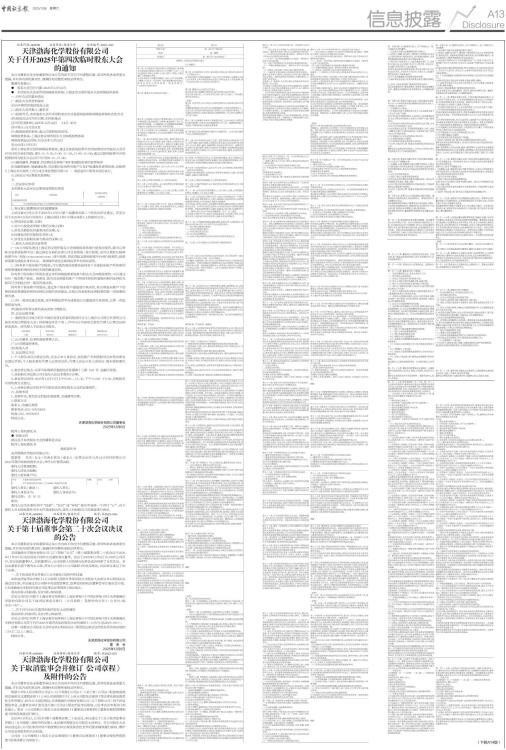 证券代码:600800 证券简称:渤海化学 公告编号:2025-058 天津渤海化学股份有限公司 关于召开2025年第四次临时股东大会的通知 本公司董事会及全体董事保证本公告内容不存在任何虚假记载、误导性陈述或者重大遗漏,并对其内容的真实性、准确性和完整性承担法律责任。 重要内容提示: ● 股东大会召开日期:2025年12月22日 ● 本次股东大会采用的网络投票系统:上海证券交易所股东大会网络投票系统 一、召开会议的基本情况 (一)股东大会类型和届次 2025年第四次临时股东大会 (二)股东大会召集人:董事会 (三)投票方式:本次股东大会所采用的表决方式是现场投票和网络投票相结合的方式 (四)现场会议召开的日期、时间和地点 召开的日期时间:2025年12月22日 14点 00分 召开地点:公司会议室 (五)网络投票的系统、起止日期和投票时间。 网络投票系统:上海证券交易所股东大会网络投票系统 网络投票起止时间:自2025年12月22日 至2025年12月22日 采用上海证券交易所网络投票系统,通过交易系统投票平台的投票时间为股东大会召开当日的交易时间段,即9:15-9:25,9:30-11:30,13:00-15:00;通过互联网投票平台的投票时间为股东大会召开当日的9:15-15:00。 (六)融资融券、转融通、约定购回业务账户和沪股通投资者的投票程序 涉及融资融券、转融通业务、约定购回业务相关账户以及沪股通投资者的投票,应按照《上海证券交易所上市公司自律监管指引第1号 一 规范运作》等有关规定执行。 (七)涉及公开征集股东投票权 无 二、会议审议事项 本次股东大会审议议案及投票股东类型 ■ 1、各议案已披露的时间和披露媒体 上述议案1已经公司于2025年12月5日第十届董事会第二十次会议审议通过,详见公司于2025年12月6日刊登在《上海证券报》和《中国证券报》上的临时公告。 2、特别决议议案:议案1 3、对中小投资者单独计票的议案:议案1 4、涉及关联股东回避表决的议案:无 应回避表决的关联股东名称:无 5、涉及优先股股东参与表决的议案:无 三、股东大会投票注意事项 (一)本公司股东通过上海证券交易所股东大会网络投票系统行使表决权的,既可以登陆交易系统投票平台(通过指定交易的证券公司交易终端)进行投票,也可以登陆互联网投票平台(网址:vote.sseinfo.com)进行投票。首次登陆互联网投票平台进行投票的,投资者需要完成股东身份认证。具体操作请见互联网投票平台网站说明。 (二)持有多个股东账户的股东,可行使的表决权数量是其名下全部股东账户所持相同类别普通股和相同品种优先股的数量总和。 持有多个股东账户的股东通过本所网络投票系统参与股东大会网络投票的,可以通过其任一股东账户参加。投票后,视为其全部股东账户下的相同类别普通股和相同品种优先股均已分别投出同一意见的表决票。 持有多个股东账户的股东,通过多个股东账户重复进行表决的,其全部股东账户下的相同类别普通股和相同品种优先股的表决意见,分别以各类别和品种股票的第一次投票结果为准。 (三)同一表决权通过现场、本所网络投票平台或其他方式重复进行表决的,以第一次投票结果为准。 (四)股东对所有议案均表决完毕才能提交。 四、会议出席对象 (一)股权登记日收市后在中国证券登记结算有限责任公司上海分公司登记在册的公司股东有权出席股东大会(具体情况详见下表),并可以以书面形式委托代理人出席会议和参加表决。该代理人不必是公司股东。 ■ (二)公司董事、监事和高级管理人员。 (三)公司聘请的律师。 (四)其他人员 五、会议登记方法 1、个人股东亲自出席会议的,应出示本人身份证、股东账户卡和持股凭证办理出席会议登记手续;个人股东委托代理人出席会议的,代理人应出示本人身份证、股东授权委托书。 2、参会登记地点:天津市滨海新区临港经济区渤海十三路 189 号 金融证券部。 3、其他相关事宜按公司《股东大会议事规则》办理。 4、参会登记时间:2025年12月18日上午9:00--11:30,下午13:00一17:00,异地股东可用传真方式登记。 5、上述参会登记手续不作为股东依法参加股东大会的必备条件。 六、其他事项 1、会期半天,参加会议的股东食宿费、交通费用自理。 2、联系方式 联系人:金融证券部 联系电话:022-58585662 传真:022-58585653 特此公告。 天津渤海化学股份有限公司董事会 2025年12月6日 附件1:授权委托书 ● 报备文件 提议召开本次股东大会的董事会决议 附件1:授权委托书 授权委托书 天津渤海化学股份有限公司: 兹委托 先生(女士)代表本单位(或本人)出席2025年12月22日召开的贵公司2025年第四次临时股东大会,并代为行使表决权。 委托人持普通股数: 委托人持优先股数: 委托人股东账户号: ■ 委托人签名(盖章): 受托人签名: 委托人身份证号: 受托人身份证号: 委托日期: 年 月 日 备注: 委托人应当在委托书中“同意”、“反对”或“弃权”意向中选择一个并打“√”,对于委托人在本授权委托书中未作具体指示的,受托人有权按自己的意愿进行表决。 证券代码:600800 证券简称:渤海化学 编号:临2025-056 天津渤海化学股份有限公司 关于第十届董事会第二十次会议决议的公告 本公司董事会及全体董事保证本公告内容不存在任何虚假记载、误导性陈述或者重大遗漏,并对其内容的真实性、准确性和完整性承担法律责任。 天津渤海化学股份有限公