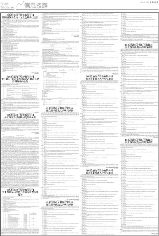 证券代码:001388 证券简称:信通电子 公告编号:2025-036 山东信通电子股份有限公司 第四届董事会第十九次会议决议公告 本公司及董事会全体成员保证信息披露的内容真实、准确、完整,没有虚假记载、误导性陈述或重大遗漏。 一、董事会会议召开情况 山东信通电子股份有限公司(以下简称“公司”)第四届董事会第十九次会议于2025年12月5日以现场会议方式在公司会议室召开,会议通知已于2025年12月3日通过邮件方式送达各位董事。本次会议应出席董事7名,实际出席董事7名。本次会议由董事长李全用先生召集并主持,公司部分高级管理人员列席了本次会议。会议的召集、召开及表决程序符合《中华人民共和国公司法》(以下简称“《公司法》”)等法律、法规、规范性文件和《公司章程》的有关规定,会议合法有效。 二、董事会会议审议情况 与会董事认真审议,通过了如下议案: 1、逐项审议通过《关于修订〈公司章程〉及制定、修订有关管理制度的议案》 为进一步完善公司法人治理结构,更好地发挥董事会的作用,根据公司实际情况和工作需要,董事会席位拟由7席调整至9席,并增设副董事长一名。公司据此修订《公司章程》及《董事会议事规则》《董事会专门委员会实施细则》2项管理制度。另结合中国证券监督管理委员会最新修订的《上市公司治理准则》,并根据公司实际情况,公司本次新制定了《董事、高级管理人员薪酬与考核管理制度》。 本议案涉及《公司章程》及管理制度逐项表决,审议结果如下: 1.1《公司章程》 表决结果:同意7票,反对0票,弃权0票。 该制度尚需提交公司2025年第五次临时股东会审议。 1.2《董事会议事规则》 表决结果:同意7票,反对0票,弃权0票。 该制度尚需提交公司2025年第五次临时股东会审议。 1.3《董事会专门委员会实施细则》 表决结果:同意7票,反对0票,弃权0票。 1.4《董事、高级管理人员薪酬与考核管理制度》 表决结果:同意7票,反对0票,弃权0票。 该制度尚需提交公司2025年第五次临时股东会审议。 具体内容详见公司同日于指定信息披露媒体《证券时报》《中国证券报》《上海证券报》《证券日报》及巨潮资讯网(www.cninfo.com.cn)披露的《关于修订〈公司章程〉及制定、修订有关管理制度的公告》(公告编号:2025-037)及披露在巨潮资讯网(www.cninfo.com.cn)上的相关制度全文。 2、逐项审议通过《关于公司董事会提前换届选举暨提名第五届董事会非独立董事候选人的议案》 为匹配公司完整会计年度,方便进行绩效考评,又鉴于第四届董事会将于2026年7月初届满,任期尚余时间较短,因此公司董事会决定提前进行董事会换届工作。根据《公司法》《公司章程》的规定,并参照深圳证券交易所主板上市公司相关业务规则的相关规定,经第四届董事会提名委员会任职资格审核通过,公司董事会拟提名李全用先生、李莉女士、王泽滨先生、任德保先生、孔志强先生为公司第五届董事会非独立董事候选人,任期三年,自公司股东会审议通过之日起计算。上述候选人符合《公司法》、深圳证券交易所主板上市公司相关业务规则及《公司章程》规定的任职资格。 出席会议的董事对以上候选人进行逐项表决,审议结果如下: 2.1关于提名李全用为第五届董事会非独立董事的议案 表决结果:同意7票,反对0票,弃权0票。 2.2关于提名李莉为第五届董事会非独立董事的议案 表决结果:同意7票,反对0票,弃权0票。 2.3关于提名王泽滨为第五届董事会非独立董事的议案 表决结果:同意7票,反对0票,弃权0票。 2.4关于提名任德保为第五届董事会非独立董事的议案 表决结果:同意7票,反对0票,弃权0票。 2.5关于提名孔志强为第五届董事会非独立董事的议案 表决结果:同意7票,反对0票,弃权0票。 本议案已经第四届董事会提名委员会2025年第三次会议审议通过。本议案尚需提交公司2025年第五次临时股东会审议,并采用累积投票方式进行选举。 具体内容详见公司同日于指定信息披露媒体《证券时报》《中国证券报》《上海证券报》《证券日报》及巨潮资讯网(www.cninfo.com.cn)披露的《关于董事会提前换届选举的公告》(公告编号:2025-038)。 3、逐项审议通过《关于公司董事会提前换届选举暨提名第五届董事会独立董事候选人的议案》 根据《公司法》《公司章程》的规定,并参照深圳证券交易所主板上市公司相关业务规则的相关规定,经第四届董事会提名委员会审核,并经下列人选同意,公司董事会拟提名刘元锁先生、丁强先生、王树亭先生为第五届董事会独立董事候选人,任期三年,自公司股东会审议通过之日起计算。 出席会议的董事对以上候选人进行逐项表决,审议结果如下: 3.1关于提名刘元锁为第五届董事会独立董事的议案 表决结果:同意7票,反对0票,弃权0票。 3.2关于提名丁强为第五届董事会独立董事的议案 表决结果:同意7票,反对0票,弃权0票。 3.3关于提名王树亭为第五届董事会独立董事的议案 表决结果:同意7票,反对0票,弃权0票。 本议案已经第四届董事会提名委员会2025年第三次会议审议通过。以上独立董事候选人均已取得深圳证券交易所独立董事资格证书,报请深圳证券交易所审核无异议后提交公司2025年第五次临时股东会审议,并采用累积投票制进行选举。 具体内容详见公司同日于指定信息披露媒体《证券时报》《中国证券报》《上海证券报》《