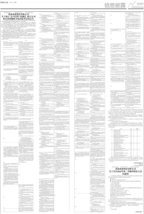 证券代码:600828 证券简称:茂业商业 编号:临2025-058号 茂业商业股份有限公司 关于修订《公司章程》及制定、修订公司相关治理制度并取消监事会的公告 本公司董事会及全体董事保证本公告内容不存在任何虚假记载、误导性陈述或者重大遗漏,并对其内容的真实性、准确性和完整性承担个别及连带责任。 茂业商业股份有限公司(以下简称“公司”)于2025年12月5日召开了第十届董事会第四十六次会议,审议通过了《关于修订〈公司章程〉及取消监事会的议案》和《关于制定及修订部分公司治理制度的议案》。同日召开第十届监事会第十七次会议,审议通过了《关于修订〈公司章程〉及取消监事会的议案》。修订《公司章程》及制定、修订公司相关治理制度并取消监事会事宜尚需提交股东大会审议。现将具体情况公告如下: 一、关于修订《公司章程》及取消监事会的情况 根据《中华人民共和国公司法》(以下简称《公司法》)、《中华人民共和国证券法》(以下简称《证券法》)、《上市公司信息披露管理办法》《上市公司章程指引》等相关法律、法规和规范性文件的最新规定,为进一步优化治理结构,公司将不再设置监事会和监事,监事会的职权由董事会审计委员会行使,并全面修订《公司章程》。 在股东大会审议通过之前,监事会及监事仍应当按照有关法律、行政法规和《公司章程》的规定继续履行职责,维护公司和全体股东利益。自修订后的《公司章程》生效之日起,公司现任监事职务相应解除,同时公司《监事会议事规则》等监事会相关制度相应废止,公司各项制度中涉及监事会、监事的规定不再适用。 依据上述相关规定,以及结合公司实际情况,拟对《公司章程》的相关条款进行修订,主要修订内容如下: ■ ■ ■ ■ ■ ■ ■ ■ ■ ■ 除上述主要修订内容外,将“股东大会”的相关表述统一修改为“股东会”,删除“监事会”“监事”或将部分条款中“监事会”修改为“审计委员会”,其他仅完善文字表述、调整目录、标点符号、条款号等非实质性内容的修订不再逐一对比列示。因删减、新增的内容而导致条款、章节序号发生变化,修订后的条款、章节序号依次顺延或递减。 本次修订《公司章程》及取消监事会的事项尚需提交公司股东会审议,同时提请股东会授权公司管理层或其授权人员办理《公司章程》变更登记备案等相关事宜,《公司章程》最终以市场监督管理部门核准的内容为准。 修订后的章程全文同日刊登于《中国证券报》、《上海证券报》、《证券时报》及上海证券交易所网站(www.sse.com.cn)。 二、关于制定及修订部分公司治理制度的情况 为全面贯彻落实最新法律法规要求,确保公司治理与监管规定同步,进一步规范公司运作机制,根据现行的《公司法》《上市公司章程指引》《上海证券交易所股票上市规则》等法律、法规及规范性文件,结合公司实际情况,对公司部分治理制度进行了补充制定及修订,具体情况如下: ■ 上述制定及修订的公司制度全文同日刊登于《中国证券报》、《上海证券报》、《证券时报》及上海证券交易所网站(www.sse.com.cn),其中1-8项制度尚需提交公司2025年第二次临时股东大会审议通过后生效,其余制度已经公司董事会审议通过后生效。 特此公告 茂业商业股份有限公司 董 事 会 二〇二五年十二月六日 证券代码:600828 证券简称:茂业商业 公告编号:临2025-059号 茂业商业股份有限公司 关于召开2025年第二次临时股东大会的通知 本公司董事会及全体董事保证本公告内容不存在任何虚假记载、误导性陈述或者重大遗漏,并对其内容的真实性、准确性和完整性承担法律责任。 重要内容提示: ● 股东大会召开日期:2025年12月22日 ● 本次股东大会采用的网络投票系统:上海证券交易所股东大会网络投票系统 一、召开会议的基本情况 (一)股东大会类型和届次 2025年第二次临时股东大会 (二)股东大会召集人:董事会 (三)投票方式:本次股东大会所采用的表决方式是现场投票和网络投票相结合的方式 (四)现场会议召开的日期、时间和地点 召开的日期时间:2025年12月22日 14点00 分 召开地点:成都市东御街19号本公司会议室 (五)网络投票的系统、起止日期和投票时间。 网络投票系统:上海证券交易所股东大会网络投票系统 网络投票起止时间:自2025年12月22日 至2025年12月22日 采用上海证券交易所网络投票系统,通过交易系统投票平台的投票时间为股东大会召开当日的交易时间段,即9:15-9:25,9:30-11:30,13:00-15:00;通过互联网投票平台的投票时间为股东大会召开当日的9:15-15:00。 (六)融资融券、转融通、约定购回业务账户和沪股通投资者的投票程序 涉及融资融券、转融通业务、约定购回业务相关账户以及沪股通投资者的投票,应按照《上海证券交易所上市公司自律监管指引第1号 一 规范运作》等有关规定执行。 (七)涉及公开征集股东投票权 无 二、会议审议事项