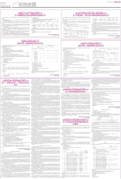 本公司董事会及全体董事保证本公告内容不存在任何虚假记载、误导性陈述或者重大遗漏,并对其内容的真实性、准确性和完整性承担法律责任。 重要内容提示: ● 本次会议是否有否决议案:无 一、会议召开和出席情况 (一)股东会召开的时间:2025年12月5日 (二)股东会召开的地点:北京市西城区阜成门北大街2号国投金融大厦505室 (三)出席会议的普通股股东和恢复表决权的优先股股东及其持有股份情况: ■ (四)表决方式是否符合《公司法》及《公司章程》的规定,股东会主持情况等。 本次股东会由公司董事会召集,董事长崔宏琴女士主持本次股东会。本次股东会采用现场投票和网络投票相结合的方式进行表决。会议的召集、召开、表决形式和程序符合《公司法》和《公司章程》的规定。 (五)公司董事和董事会秘书的出席情况 1、公司在任董事7人,出席7人; 2、董事会秘书出席;部分高管列席。 二、议案审议情况 (一)非累积投票议案 1、议案名称:国投资本股份有限公司关于续聘2025年财务报表审计机构和内部控制审计机构的议案 审议结果:通过 表决情况: ■ 2、议案名称:国投资本股份有限公司关于董事长及相关董事2024年绩效考核及绩效奖金兑现的议案 审议结果:通过 表决情况: ■ (二)累积投票议案表决情况 3、关于选举董事的议案 ■ (三)涉及重大事项,5%以下股东的表决情况 ■ (四)关于议案表决的有关情况说明 1、特别决议议案:无 2、对中小投资者单独计票的议案:1、2、3 3、涉及关联股东回避表决的议案:无 4、涉及优先股股东参与表决的议案:无 三、律师见证情况 1、本次股东会见证的律师事务所:北京天达共和律师事务所 律师:邢冬梅、杨嘉欣 2、律师见证结论意见: 国投资本本次股东会的召集和召开的程序、出席本次股东会人员及会议召集人的资格、本次股东会的表决程序符合有关法律及《公司章程》的规定,本次股东会的表决结果合法有效。 特此公告。 国投资本股份有限公司董事会 2025年12月6日