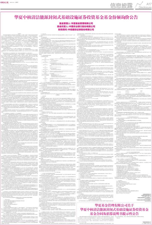 特别提示 华夏中核清洁能源封闭式基础设施证券投资基金(以下简称“本基金”)根据中国证券监督管理委员会(以下简称“中国证监会”)和中华人民共和国国家发展和改革委员会(以下简称“国家发改委”)颁布的《关于推进基础设施领域不动产投资信托基金(REITs)试点相关工作的通知》《关于规范高效做好基础设施领域不动产投资信托基金(REITs)项目申报推荐工作的通知》(以下简称“《通知》”)、中国证监会颁布的《公开募集基础设施证券投资基金指引(试行)》(以下简称“《基础设施基金指引》”),上海证券交易所(以下简称“上交所”)颁布的《上海证券交易所公开募集基础设施证券投资基金(REITs)业务办法(试行)》(以下简称“《业务办法》”)、《上海证券交易所公开募集基础设施证券投资基金(REITs)规则适用指引第1号一审核关注事项(试行)(2024年修订)》(以下简称“《审核指引》”)、《上海证券交易所公开募集基础设施证券投资基金(REITs)规则适用指引第2号一发售业务(试行)》(以下简称“《发售指引》”),以及中国证券业协会(以下简称“证券业协会”)颁布的《公开募集基础设施证券投资基金网下投资者管理细则》(以下简称“《网下投资者管理细则》”)等相关法律及规定组织实施发售工作。 中信建投证券股份有限公司(以下简称“中信建投证券”)担任本基金财务顾问。 本次网下询价将通过上交所的“REITs询价与认购系统”进行,请投资者认真阅读本公告。关于基础设施基金询价、定价、认购等详细规则,请查阅上交所网站(http://www.sse.com.cn)公布的《发售指引》。 敬请投资者重点关注本次发售的网下询价、投资者认购和缴款等方面,具体内容如下: 1、本基金将采用向战略投资者定向配售(以下简称“战略配售”)、向符合条件的网下投资者询价配售(以下简称“网下发售”)、向公众投资者公开发售(以下简称“公众发售”)相结合的方式进行发售,发售方式包括通过具有基金销售业务资格并经上交所和中国证券登记结算有限责任公司认可的上交所会员单位(“场内证券经营机构”)或基金管理人及其委托的场外基金销售机构进行发售。 本次战略配售、网下发售由基金管理人及财务顾问负责组织;公众发售由基金管理人负责组织。网下发售通过上交所“REITs询价与认购系统”实施;公众发售通过上交所场内证券经营机构、基金管理人及其委托的场外基金销售机构实施;战略配售通过基金管理人实施。 2、基金管理人和财务顾问协商确定本次询价区间为3.356元/份一5.033元/份,并将通过网下询价最终确定基金份额的认购价格。 3、询价时间:本次发售的询价期间为2025年12月17日的9:00-15:00。 4、网下发售对象:网下投资者为证券公司、基金管理公司、信托公司、财务公司、保险公司及保险资产管理公司、合格境外投资者、商业银行及商业银行理财子公司、政策性银行、符合规定的私募基金管理人以及其他符合中国证监会及上海证券交易所投资者适当性规定的专业机构投资者。全国社会保障基金、基本养老保险基金、年金基金等可根据有关规定参与基础设施基金网下询价。 5、同一投资者多档报价:本次询价采取拟认购价格与拟认购份额数量同时申报的方式进行,网下投资者及其管理的配售对象的报价应当包含拟认购价格和该价格对应的拟认购份额数量。参与询价的网下投资者需在询价区间范围内进行报价,可为其管理的不同配售对象分别填报一个报价,报价应当包含每份价格和该价格对应的拟认购份额数量,且同一网下投资者全部报价中的不同拟认购价格不得超过3个。网下投资者为拟参与报价的全部配售对象录入报价记录后,应当一次性提交。网下投资者可以多次提交报价记录,但以最后一次提交的全部报价记录为准。 网下投资者及其管理的配售对象应遵守行业监管要求,加强风险控制和合规管理,合理确定拟认购价格和拟认购份额数量。参与询价时,请特别留意拟认购价格和拟认购份额数量对应的拟认购金额是否超过其提供的资产规模或资金规模。 基金管理人及财务顾问发现配售对象不遵守行业监管要求、超过其向基金管理人及财务顾问提交资产证明材料中相应资产规模或资金规模认购的,则该配售对象的认购无效。 参加网下询价的投资者应在2025年12月16日中午12:00前将资产证明材料通过华夏基金公募REITs网下投资者资格核查系统(https://reits.chinaamc.com/)提交给基金管理人及财务顾问。如投资者拒绝配合核查、未能完整提交相关材料或者提交的材料不足以排除其存在法律、法规、规范性文件禁止参与网下发售情形的,基金管理人及财务顾问将拒绝其参与本次网下发售、将其报价作为无效报价处理或不予配售,并在《华夏中核清洁能源封闭式基础设施证券投资基金基金份额发售公告》(“《发售公告》”)中予以披露。网下投资者违反规定参与本基金网下发售的,应自行承担由此产生的全部责任。 6、延迟发售安排:若本次认购价格高于剔除不符合条件报价后网下投资者报价的中位数和加权平均数的孰低值,基金管理人及财务顾问将在基金份额认购首日前5个工作日发布投资风险特别公告,本次基金份额发售期将相应延迟。 7、限售期安排:公众发售部分的基金份额无流通限制及锁定期安排,战略投资者认购基金的限售期安排详见