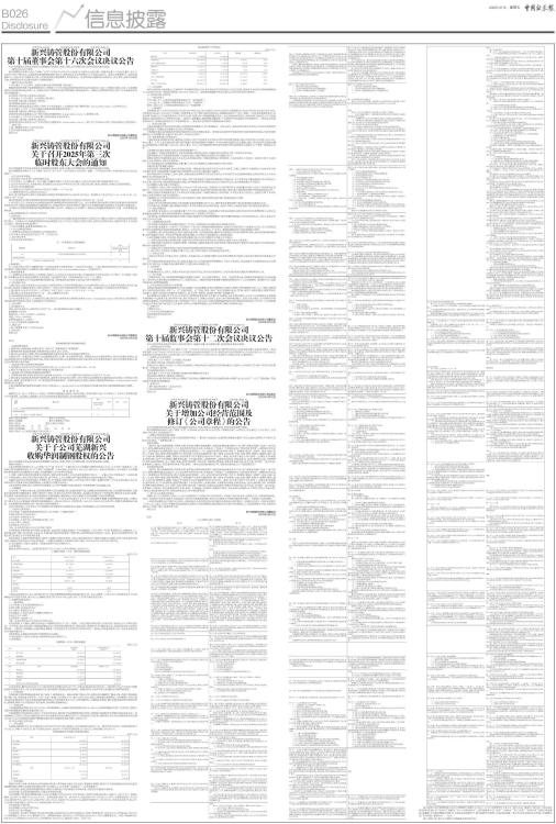 证券代码:000778 证券简称:新兴铸管 公告编号:2025-51 新兴铸管股份有限公司 第十届董事会第十六次会议决议公告 本公司及董事会全体成员保证信息披露的内容真实、准确、完整,没有虚假记载、误导性陈述或重大遗漏。 一、董事会会议召开情况 新兴铸管股份有限公司(以下简称“公司”)于2025年12月5日以书面和电子邮件方式发出第十届董事会第十六次会议通知,会议于2025年12月9日至10日,以现场会议及通讯表决的形式召开,现场会议在北京市财富中心公司会议室召开。会议应出席董事7人,实际出席董事7人,会议由何齐书董事长主持,公司监事和部分高级管理人员列席会议。会议按照会议通知所列议程进行,会议召集、出席会议董事人数、程序等符合有关法律法规和公司章程的规定。 二、董事会会议审议情况 1、审议通过了《关于制订〈违规违纪责任追究管理制度〉的议案》。 根据国务院国有资产监督管理委员会(国资委)?《中央企业违规经营投资责任追究实施办法(试行)》的相关规定,为进一步加强和规范公司违规违纪责任追究工作,加强公司生产经营管理,提升管控效能,规范业务执行。根据公司经营管控要求,制订了《违规违纪责任追究管理制度》。 表决结果:7票同意、0票弃权、0票反对。 2、审议通过了《关于修订〈公司章程〉的议案》。 表决结果:7票同意、0票弃权、0票反对。 该议案需提交股东大会审议。 该事项的详细内容请见公司同日刊登于《中国证券报》、《证券时报》和巨潮资讯网(www.cninfo.com.cn)上的相关公告。 3、审议通过了《关于子公司芜湖新兴收购华润制钢股权的议案》。 表决结果:7票同意、0票弃权、0票反对。 该事项的详细内容请见公司于同日刊登在巨潮资讯网(www.cninfo.com.cn)上的相关公告。 4、审议通过了《关于召开2025年第三次临时股东大会的议案》。 表决结果:7票同意、0票弃权、0票反对。 该事项的详细内容请见公司于同日刊登在巨潮资讯网(www.cninfo.com.cn)上的《关于召开2025年第三次临时股东大会的通知》。 三、备查文件 1、第十届董事会第十六次会议决议; 2、深交所要求的其他文件。 特此公告 新兴铸管股份有限公司董事会 2025年12月12日 证券代码:000778 证券简称:新兴铸管 公告编号:2025-52 新兴铸管股份有限公司 关于召开2025年第三次 临时股东大会的通知 本公司及董事会全体成员保证信息披露的内容真实、准确、完整,没有虚假记载、误导性陈述或重大遗漏。 新兴铸管股份有限公司(以下简称“本公司”或“公司”)拟于2025年12月29日(星期一)召开2025年第三次临时股东大会,会议安排如下: 一、召开会议基本情况 1、会议届次:2025年第三次临时股东大会。 2、会议召集人:公司董事会。经公司第十届董事会第十六次会议审议通过,决定召开2025年第三次临时股东大会。 3、会议召开的合法性、合规性情况:本次股东大会会议召开符合有关法律、行政法规、部门规章、规范性文件和公司章程的规定。 4、会议召开的日期和时间: (1)现场会议召开时间为:2025年12月29日(星期一)下午14:30 (2)网络投票时间为:2025年12月29日 其中:通过深圳证券交易所交易系统进行网络投票的具体时间为:2025年12月29日(现场股东大会召开日)9:15一9:25,9:30一11:30和13:00一15:00 通过深圳证券交易所互联网投票系统进行网络投票的具体时间为:2025年12月29日9:15-15:00 5、会议召开方式:本次股东大会采取现场投票与网络投票表决相结合的方式。本公司将通过深圳证券交易所交易系统和互联网投票系统向本公司全体股东提供网络形式的投票平台,在股权登记日登记在册的公司股东可以在网络投票时间内通过上述系统行使表决权。 公司股东应选择现场投票或网络投票两种投票方式中的一种表决方式,如果同一表决权出现重复投票表决的,以第一次投票表决结果为准。 6、会议的股权登记日:2025年12月22日 7、出席对象: (1)截至股权登记日2025年12月22日下午收市后在中国证券登记结算有限责任公司深圳分公司登记在册的公司股东或其授权委托的代理人。上述本公司全体普通股股东均有权出席股东大会,并可以以书面形式委托代理人出席会议和参加表决,该股东代理人不必是本公司股东。授权委托书请见附件2。 (2)本公司董事、监事和高级管理人员。 (3)本公司聘请的律师。 (4)根据相关法规应当出席股东大会的其他成员。 8、会议地点:河北省武安市2672厂区 公司会议室 二、会议审议事项 1、本次会议审议事项如下: 表一:本次股东大会提案编码 ■ 2、披露情况 以上议案已经公司第十届董事会第十六次会议及第十届监事会第十二次会议审议通过,上述议案的内容详见公司于2025年12月12日刊登在《中国证券报》《证券时报》和巨潮资讯网站(http://www.cninfo.com.cn)上的相关公告。 3、特别强调事项 (1)根据相关法律法规及《公司章程》的规定,公司此次召开的2025年第三次临时股东大会所审议的《关于修订〈公司章程〉的议案》为特殊决议事项,需经出席股东大会的股东(包括股东代理人)所持表决权的三分之二以上通过。 (2)上述议案将对中小投资者的表决单独计票,并将表决结果在股东大会决议公告中单独列示。 三、会议登记方法 1、登记方式:出席本次股东大会会议的个人股东应持本人身份证和持股凭证;法人股东持单位证明、法人委托书和出席人身份证;股