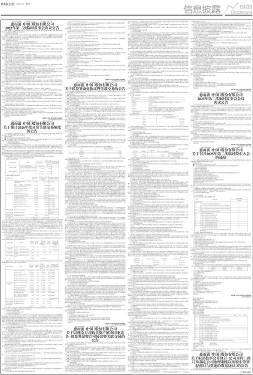 证券代码:600983 股票简称:惠而浦 公告编号:2025-030 惠而浦(中国)股份有限公司 2025年第三次临时董事会决议公告 本公司董事会及全体董事保证本公告内容不存在任何虚假记载、误导性陈述或者重大遗漏,并对其内容的真实性、准确性和完整性承担法律责任。 一、董事会会议召开情况 惠而浦(中国)股份有限公司(以下简称“公司”)2025年第三次临时董事会会议通知于2025年12月8日以电子邮件方式发出,会议于2025年12月11日以现场及通讯表决的方式召开。应当出席董事12名,实际出席董事12名。会议由董事长梁昭贤主持,公司监事和高级管理人员列席会议。本次会议的召集、召开符合有关法律法规和《公司章程》的规定,会议决议合法、有效。 二、董事会会议审议情况 1、审议通过《关于预计2026年度日常关联交易额度的议案》 公司2025年1-10月累计发生各类日常关联交易总额为270,561.32万元。预计2026年度公司累计日常关联交易金额为452,570.00万元。 本议案已经公司独立董事专门会议审议通过,并同意将本议案提交公司董事会审议。 本议案尚需提交公司股东大会审议。 表决结果:4票同意,0票弃权,0票反对,关联董事梁昭贤、Lee Edwards(艾德华)、梁惠强、梁翠玲、杨前春、王红强、秦雄、冯熙文回避表决。 具体公告内容详见公司同日于上海证券交易所网站www.sse.com.cn刊登的《关于预计2026年度日常关联交易额度的公告》。 2、审议通过《关于取消监事会并修订〈公司章程〉的议案》 根据《公司法》《上市公司章程指引》等相关规定,公司将不再设置监事会,监事会相关职权由公司董事会审计委员会行使,《公司监事会议事规则》相应废止。公司将调整董事会结构,设职工代表董事1名;公司董事会席位不变,由12名董事组成,其中:职工代表董事1名,除职工代表董事外的非独立董事7名,独立董事4名。 基于上述安排,公司对《公司章程》进行相应修订。 本议案尚需提交公司股东大会审议。 表决结果:12票同意,0票弃权,0票反对。 具体公告内容详见公司同日于上海证券交易所网站www.sse.com.cn刊登的《关于取消监事会并修订〈公司章程〉、修订及制定公司治理制度以及股东签署〈经修订与重述的股东协议〉的公告》。 3、审议通过《关于修订及制定公司治理制度的议案》 为进一步提升和完善公司规范运作水平,根据《公司法》《上市公司章程指引》等有关规定,结合上述取消监事会等事宜及公司实际经营需要,公司修订了相关治理制度,并制定《董事离职管理制度》。 修订后的《股东会议事规则》《董事会议事规则》《独立董事工作制度》《内部关联交易决策制度》《对外担保决策制度》《对外投资管理制度》《募集资金管理制度》尚需提交公司股东大会审议。 表决结果:12票同意,0票弃权,0票反对。 具体公告内容详见公司同日于上海证券交易所网站www.sse.com.cn刊登的《关于取消监事会并修订〈公司章程〉、修订及制定公司治理制度以及股东签署〈经修订与重述的股东协议〉的公告》。 4、审议通过《关于拟签署商业协议暨关联交易的议案》 为更好地适应实际经营及进一步业务发展需求,公司拟与Whirlpool Corporation签署《〈技术和知识产权许可协议〉的第二修正案》,对经2024年修正案修订后的《技术和知识产权许可协议》的部分条款及条件进行进一步修订。 本议案已分别经公司独立董事专门会议、董事会战略委员会审议通过,并同意将本议案提交公司董事会审议。 本议案尚需提交公司股东大会审议。 表决结果:11票同意,0票弃权,0票反对,关联董事Lee Edwards(艾德华)回避表决。 具体公告内容详见公司同日于上海证券交易所网站www.sse.com.cn刊登的《关于拟签署商业协议暨关联交易的公告》。 5、审议通过《关于以现金方式购买资产解决同业竞争、拟签署品牌许可协议暨关联交易的议案》 公司拟以现金方式购买公司的控股股东广东格兰仕家用电器制造有限公司(以下简称“格兰仕家用电器”)的洗衣机(含干衣机)业务有关资产,该等资产包括固定资产、专利、专有技术和产品。本次资产收购完成后,格兰仕家用电器及其实际控制人与公司不再存在实质性同业竞争。 公司拟与格兰仕家用电器签署《品牌许可协议》,格兰仕家用电器拟以全球范围内独占使用许可的方式将洗衣机业务有关商标许可给公司使用。 本议案已分别经公司独立董事专门会议、董事会战略委员会审议通过,并同意将本议案提交公司董事会审议。 本议案尚需提交公司股东大会审议。 表决结果:5票同意,0票弃权,0票反对,关联董事梁昭贤、梁惠强、梁翠玲、杨前春、王红强、秦雄、冯熙文回避表决。 具体公告内容详见公司同日于上海证券交易所网站www.sse.com.cn刊登的《关于以现金方式购买资产解决同业竞争、拟签署品牌许可协议暨关联交易的公告》。 6、审议通过《将上述相关议案提交公司2025年第二次临时股东大会审议》 同意召开公司2025年第二次临时股东大会,将上述尚需提交公司股东大会审议的议案提交公司2025年第二次临时股东大会审议,股东大会会议通知将另行发布。 表决结果:12票同意,0票弃权,0票反对。 特此公告。 惠而浦(中国)股份有限公司董事会 二〇二五年十二月十二日 证券代码:600983 股票简称:惠而浦 公告编号:2025-031 惠而浦(中国)股份有限公司 关于预计2026年度日常关
