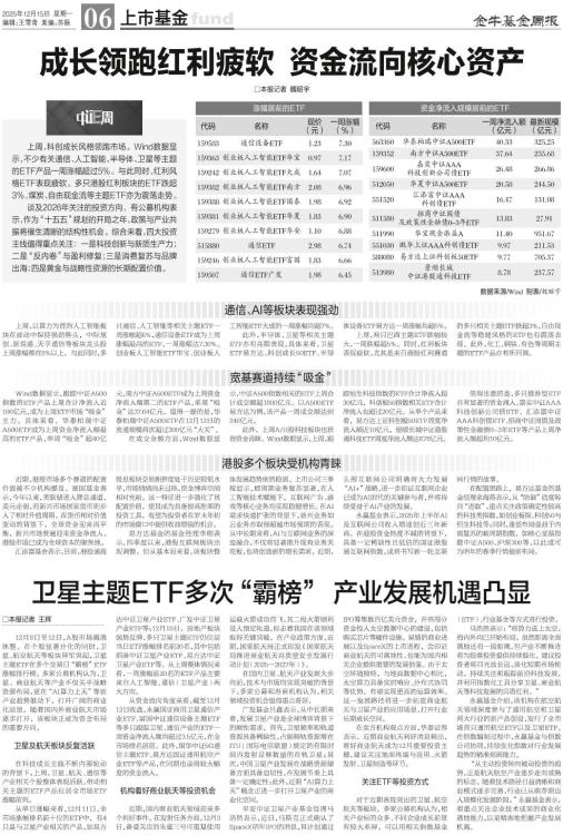 □本报记者 魏昭宇 上周,科创成长风格领跑市场。Wind数据显示,不少有关通信、人工智能、半导体、卫星等主题的ETF产品一周涨幅超过5%。与此同时,红利风格ETF表现疲软。多只港股红利板块的ETF跌超3%,煤炭、自由现金流等主题ETF亦为震荡走势。 谈及2026年关注的投资方向,有公募机构表示,作为“十五五”规划的开局之年,政策与产业共振将催生清晰的结构性机会。综合来看,四大投资主线值得重点关注:一是科技创新与新质生产力;二是“反内卷”与盈利修复;三是消费复苏与品牌出海;四是黄金与战略性资源的长期配置价值。 通信、AI等板块表现强劲 上周,以算力为首的人工智能板块在波动中保持强劲势头,中际旭创、新易盛、天孚通信等板块龙头股上周涨幅都在8%以上。与此同时,多只通信、人工智能等相关主题ETF一周涨幅超6%,通信设备ETF成为上周涨幅最高的ETF,一周涨幅达7.30%。创业板人工智能ETF华宝、创业板人工智能ETF大成的一周涨幅均超7%。 此外,半导体、卫星等相关主题ETF亦有亮眼表现,具体来看,卫星ETF易方达、科创成长50ETF、半导体设备ETF易方达一周涨幅均超5%。 上周,两只巴西主题ETF跌幅较大,一周跌幅超5%。同时,红利板块表现疲软,尤其是来自港股红利赛道的多只相关主题ETF跌超3%,自由现金流等稳健风格的ETF也有震荡表现。此外,化工、钢铁、有色等周期主题的ETF产品亦有所回调。 宽基赛道持续“吸金” Wind数据显示,跟踪中证A500指数的ETF产品上周合计净流入近100亿元,成为上周ETF市场“吸金”主力。具体来看,华泰柏瑞中证A500ETF成为上周资金净流入额最高的ETF产品,单周“吸金”超40亿元,南方中证A500ETF成为上周资金净流入额第二的ETF产品,单周“吸金”达37.64亿元。值得一提的是,华泰柏瑞中证A500ETF在12月12日的流通规模首次超过300亿元“大关”。 在成交金额方面,Wind数据显示,中证A500指数相关的ETF上周合计成交额超1800亿元。以A500ETF易方达为例,该产品一周成交额达到246亿元。 此外,上周A/H股科技板块也获得资金青睐。Wind数据显示,上周,跟踪恒生科技指数的ETF合计净流入超30亿元,科创板50指数相关ETF合计净流入也超过20亿元。从单个产品来看,易方达上证科创板50ETF周度净流入额近10亿元,景顺长城中证港股通科技ETF周度净流入额达8.78亿元。 值得注意的是,多只债券型ETF亦有显著的资金涌入。嘉实中证AAA科技创新公司债ETF、汇添富中证AAA科创债ETF、招商中证国债及政策性金融债0-3年ETF等产品上周净流入额超均10亿元。 港股多个板块受机构青睐 近期,港股市场多个赛道的配置价值被不少机构提及。富国基金表示,今年以来,美联储进入降息通道,美元走弱,而新兴市场国家货币则步入了相对升值周期。在货币相对价值变动的背景下,全球资金迎来再平衡,新兴市场普遍迎来资金净流入,港股市场已成为全球资本的聚焦地。 汇添富基金表示,目前,港股通高股息板块交易拥挤度处于历史较低水平,市场情绪尚未过热,资金博弈空间相对充裕。这一特征进一步强化了其配置价值,使其成为具备较高胜率的投资工具,有望为投资者在岁末年初的市场窗口中提供收益增强的机会。 易方达基金的基金经理李栩表示,四季度以来,港股互联网板块出现调整。但从基本面来看,该板块整体发展趋势依然稳固。上市公司三季报显示,顺周期业务复苏显著,在人工智能技术赋能下,互联网广告、游戏等核心业务均实现稳健增长。在AI需求快速扩张的背景下,新兴业务如云业务亦取得超越市场预期的表现。从中长期来看,AI与互联网业务的深度融合,不仅将显著推升现有业务天花板,也将创造新的增长需求。近期,头部互联网公司明确将大力发展“AI+”战略,进一步印证互联网企业已成为AI时代的关键参与者,并将持续受益于AI产业的发展。 永赢基金表示,2025年上半年AI及互联网公司收入增速创近三年新高,在港股资金热度不减的背景下,具备一定稀缺性且低估的国证港股通互联网指数,或将书写新一轮互联网行情的故事。 在配置思路上,易方达基金的基金经理余海燕表示,从“防御”适度转向“进取”,重点关注政策确定性较高的科技类指数,如创业板指、科创50与恒生科技等;同时,逢低布局受益于内需复苏的顺周期指数,如核心宽基指数中证A500、沪深300等,以此或可为明年的春季行情提前布局。