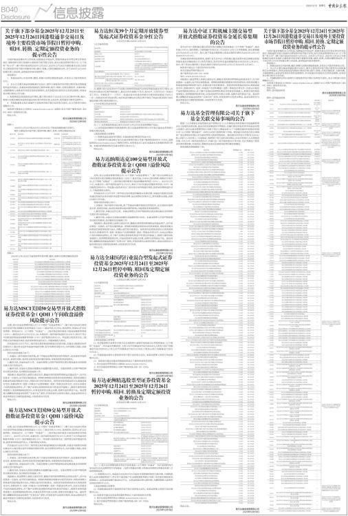 为保护基金份额持有人的利益,保障基金平稳运作,根据各基金合同等法律文件相关规定、港股通非交易日及境外主要投资市场节假日安排,易方达基金管理有限公司(以下简称“本公司”)旗下部分基金因2025年12月25日、2025年12月26日为港股通非交易日及境外主要投资市场节假日将暂停申购、赎回、转换、定期定额投资业务,并于2025年12月29日恢复办理上述业务,适用基金列表详见附件1。 特别提示: 1.各基金是否已开放申购、赎回、转换与定期定额投资业务,详见本公司发布的相关公告。 2.本公告主要为基金因港股通非交易日、境外主要投资市场节假日暂停及后续恢复相关业务的提示,各基金如因其他原因已暂停申购、赎回、转换、定期定额投资、大额申购、大额转换转入业务或有其他交易状态限制的,本次恢复后仍受相关交易状态限制,具体业务办理以相关公告为准。 3. 根据各基金具体投资运作情况,旗下部分原定于2025年12月24日暂停申购、赎回、转换与定期定额投资业务的基金将在该日照常开放上述业务,适用基金列表详见附件2。 4.若港股通非交易日或境外主要投资市场节假日安排发生变化,本公司将进行相应调整并公告。 投资者可登录本公司网站(www.efunds.com.cn)或拨打本公司客户服务电话(400 881 8088)获取相关信息。 特此公告。 易方达基金管理有限公司 2025年12月19日 附件1: 2025年12月25日至2025年12月26日以下基金因港股通非交易日、 境外主要投资市场节假日暂停申购、赎回、转换、定期定额投资业务 ■ 附件2: 2025年12月24日以下基金照常开放申购、赎回、转换与定期定额投资业务 ■ 易方达MSCI美国50交易型开放式指数证券投资基金(QDII)午间收盘溢价 风险提示公告 近期,易方达基金管理有限公司(以下简称“本基金管理人”)旗下易方达MSCI美国50交易型开放式指数证券投资基金(QDII)(基金代码:513850,场内简称:美国50,扩位证券简称:美国50ETF,以下简称“本基金”)二级市场交易价格高于基金份额参考净值(IOPV)。截至2025年12月18日11:30,本基金在二级市场的收盘价为1.654元,相对于当日午间收盘时的基金份额参考净值(IOPV)溢价幅度达到4.91%。特此提示投资者关注二级市场交易价格溢价风险,投资者如果高溢价买入,可能面临较大损失。 若本基金在公告日当日二级市场交易价格溢价幅度未有效回落,本基金可根据实际情况通过向上海证券交易所申请盘中临时停牌、延长停牌时间等方式,向市场警示风险,具体以届时公告为准。 现特向投资者提示如下: 1、本基金二级市场的交易价格,除了有基金份额净值变化的风险外,还会受到市场供求关系、系统性风险、流动性风险等其他因素的影响,可能使投资者面临损失。 2、截至目前,本基金运作正常。本基金管理人仍将严格按照法律法规及基金合同的相关规定进行投资运作。 3、截至目前,本基金无其他应披露而未披露的重大信息。本基金管理人仍将严格按照有关规定和要求,及时做好信息披露工作。 风险提示:基金管理人承诺以诚实信用、勤勉尽责的原则管理和运用基金资产,但不保证基金一定盈利,也不保证最低收益。销售机构根据法规要求对投资者类别、风险承受能力和基金的风险等级进行划分,并提出适当性匹配意见。投资者在投资基金前应认真阅读基金合同、招募说明书(更新)和基金产品资料概要(更新)等基金法律文件,全面认识基金产品的风险收益特征,在了解产品情况及销售机构适当性意见的基础上,根据自身的风险承受能力、投资期限和投资目标,对基金投资作出独立决策,选择合适的基金产品。基金管理人提醒投资者基金投资的“买者自负”原则,在投资者作出投资决策后,基金运营状况与基金净值变化引致的投资风险,由投资者自行负责。 特此公告。 易方达基金管理有限公司 2025年12月18日 易方达MSCI美国50交易型开放式 指数证券投资基金(QDII)溢价风险 提示公告 近期,易方达基金管理有限公司(以下简称“本基金管理人”)旗下易方达MSCI美国50交易型开放式指数证券投资基金(QDII)(基金代码:513850,场内简称:美国50,扩位证券简称:美国50ETF,以下简称“本基金”)二级市场交易价格高于基金份额参考净值(IOPV)。2025年12月18日,本基金在二级市场的收盘价为1.657元,相对于当日的基金份额参考净值(IOPV)溢价幅度达到5.10%。特此提示投资者关注二级市场交易价格溢价风险,投资者如果高溢价买入,可能面临较大损失。 若本基金在公告日当日二级市场交易价格溢价幅度未有效回落,本基金可根据实际情况通过向上海证券交易所申请盘中临时停牌、延长停牌时间等方式,向市场警示风险,具体以届时公告为准。 现特向投资者提示如下: 1、本基金二级市场的交易价格,除了有基金份额净值变化的风险外,还会受到市场供求关系、系统性风险、流动性风险等其他因素的影响,可能使投资者面临损失。 2、截至目前,本基金运作正常。本基金管理人仍将严格按照法律法规及基金合同的相关规定进行投资运作。 3、截至目前,本基金无其他应披露而未披露的重大信息。本基金管理人仍将严格按照有关规定和要求,及时做好信息披露工作。 风险提示:基金管理人承诺以诚实信用、勤勉尽责的原则管理和运用基金资产,但不保证基金一定盈利,也不保证最低收益。销售机构根据法规要求对投资者类别、风险承受能力和基金的