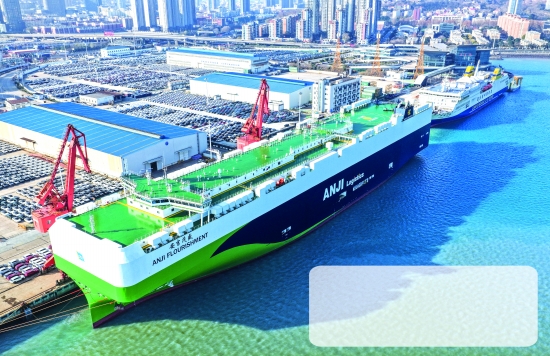 2025年12月17日,在江苏连云港港口68号泊位,一艘滚装船在装运出口汽车(无人机照片)。