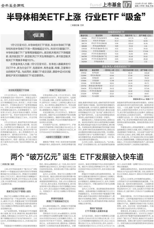 □本报记者 张韵 上周,ETF市场迎来两个“破万亿元”里程碑事件——华夏基金成为国内首家ETF管理规模突破万亿元的基金公司,跨境ETF总规模首度站上万亿元关口。叠加全市场ETF规模超6万亿元的整体扩容态势,ETF市场正以多点突破之势,开启资管市场工具化配置的全新格局,驶入发展快车道。 头部机构领跑: 首家万亿元ETF管理人诞生 首家万亿元规模ETF管理人诞生,成为上周公募基金行业一个标志性事件。Wind数据显示,截至1月12日,华夏基金旗下ETF管理规模达10164.24亿元,华夏基金成为国内首家跻身万亿元规模ETF管理俱乐部的公募机构,创行业发展新纪录。 从产品结构来看,华夏基金ETF布局覆盖核心宽基、热门行业、跨境市场、商品债券等多元赛道,共拥有超过110只ETF产品。其中,公司旗下规模最大的2只产品为沪深300ETF、上证50ETF,前者规模超2300亿元,后者突破1800亿元。 华夏基金ETF规模增长呈现显著双轮驱动特征。据Wind数据统计,近一年来,该公司ETF规模增长超过3800亿元,其中超过1200亿元来自投资者净申购,其余部分源于市场上涨带来的基金规模提升。 业内人士分析称,首家万亿元规模ETF管理人的出现,既是头部机构先发优势的集中体现,也是ETF这类工具性产品布局容易出现强者愈强局面的鲜明印证。目前,ETF头部效应进一步凸显,易方达基金、华泰柏瑞基金、南方基金等多家大型公募基金公司ETF规模超过4000亿元。其中,易方达基金ETF规模已超过9200亿元,有望成为下一家万亿元规模ETF管理俱乐部的成员。 跨境布局提速: 跨境ETF规模首破万亿元 在头部机构领跑之外,跨境ETF市场的爆发式增长,也成为拉动全行业规模扩容的另一重要引擎。 同样是在1月12日,Wind数据显示,全市场207只跨境ETF总规模首度攀升至破万亿元,较2025年初的约4240亿元实现翻倍式增长。仅2026年开年不到半个月时间,规模就新增700多亿元。从资金流向分析,港股科技、互联网及创新药三大领域成为投资者配置热点。回看2025年,新成立的跨境ETF也大多投向港股市场。接近70只新成立的跨境ETF中,除了1只新兴亚洲ETF和2只巴西ETF外,其余全部投向港股市场。 跨境ETF市场的头部化趋势同样明显。富国中证港股通互联网ETF以超800亿元规模大幅领先,位于跨境ETF规模首位。华夏恒生科技ETF紧随其后,规模超过500亿元。此外,华泰柏瑞恒生科技ETF、中概互联网ETF易方达规模均站上400亿元。 业内人士分析称,居民跨境投资需求的持续释放,是推动跨境ETF规模突破万亿元关口的重要驱动力。在居民全球资产配置意识不断增强与海外市场结构性行情的双重驱动下,跨境ETF实现跨越式增长。其所具有的100元起投、T+0交易等优势,使普通投资者能以较低成本触达全球市场。 整体扩容加速: ETF市场驶入发展快车道 从行业全局看,我国ETF规模增长呈现提速态势:自2004年首只ETF推出以来,第一个万亿元市场规模的突破耗时近16年;而从1万亿元增长至6万亿元,仅用5年时间,其中,2025年一年就接连突破4万亿元、5万亿元、6万亿元三大关口,2026年规模一度攀升至6.2万亿元以上,增长动能强劲。 规模快速增长的背后,是投资者结构的持续优化与产品生态的不断完善。目前,股票ETF仍占主导地位,商品ETF、债券ETF则成为重要增长极。 业内人士分析称,ETF规模的快速增长,一方面得益于近年来的指数投资发展浪潮,产品加速上新,投资者对透明度更高、工具属性更强、投资效率更高的ETF青睐度提升,促使许多资金流向ETF;另一方面,这也离不开市场行情的推动,在上涨行情中,许多ETF产品规模水涨船高。 值得注意的是,在ETF市场马太效应显著的环境下,已经有越来越多基金公司开始思考差异化打法。例如,自主设计开发具有竞争力的指数ETF产品,落脚细分领域ETF抢占先发优势等。此外,在ETF统一更名的浪潮中,打造ETF品牌力也成为许多公司的着力点。 展望未来,多位基金人士分析称,ETF市场仍有望持续释放增长潜力。ETF作为工具型产品,或将在资产配置中发挥愈发重要的作用。此次两个“破万亿元”的问世,既是ETF行业多年深耕的成果,更预示着行业将开启新的发展窗口,持续为满足居民财富管理的多样化需求注入新动能。
