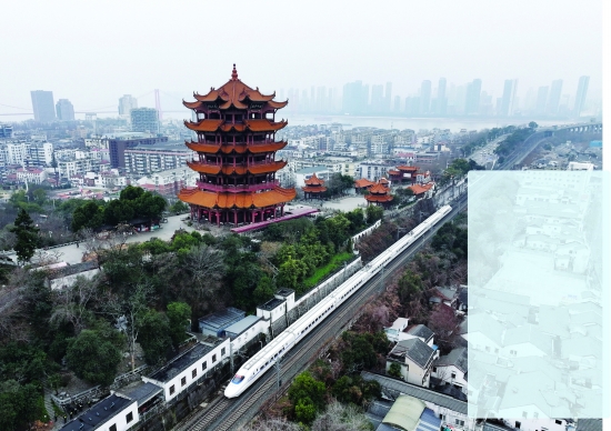 1月25日,一列动车组列车经过湖北省武汉市黄鹤楼景区(无人机照片)。