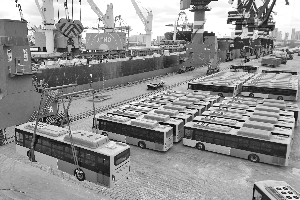 图为2月6日出口墨西哥的天然气公交车在山东港口烟台港装船(无人机照片)。 2月7日,100台出口墨西哥的天然气公交车在山东港口烟台港完成装船并启程。这批天然气公交车是安凯客车基于墨西哥市场需求研发的定制化产品,拥有更低气耗、更强动力和更长续航,将投入到墨西哥蒙特雷市的公共交通系统。 新华社发(唐克摄)