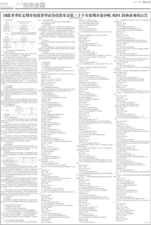 国联季季红定期开放债券型证券投资基金第三十个开放期开放申购、赎回、转换业务的公告