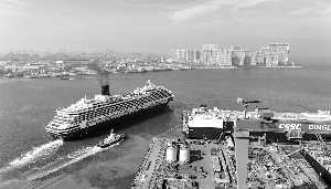 图为2月28日“理想”号邮轮完成常规坞修及保养任务,驶离中国船舶集团青岛北海造船有限公司码头。 据悉,“理想”号邮轮是来自意大利的10.3万总吨邮轮,2025年12月24日进场开展常规坞修。 新华社发(张进刚 摄)