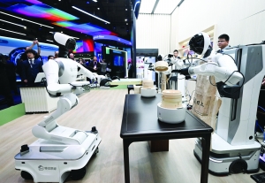2026年世界移动通信大会上,人们在中国移动展台参观厨房机器人。 新华社图片