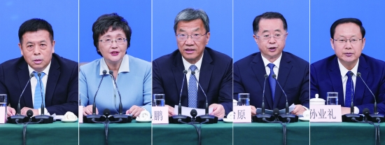 3月7日,十四届全国人大四次会议在北京梅地亚中心新闻发布厅举行记者会。教育部部长怀进鹏(中)、民政部部长陆治原(右二)、人力资源和社会保障部部长王晓萍(左二)、文化和旅游部部长孙业礼(右一)、国家卫生健康委员会主任雷海潮(左一)就教育、民政、人力资源和社会保障、文旅、卫生健康等相关问题回答中外记者提问(拼版照片)。 新华社记者 王曦 摄