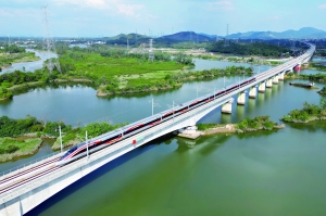 从湛江北站开往广州白云站的列车驶过丰头河特大桥。 新华社发(魏婕 摄)