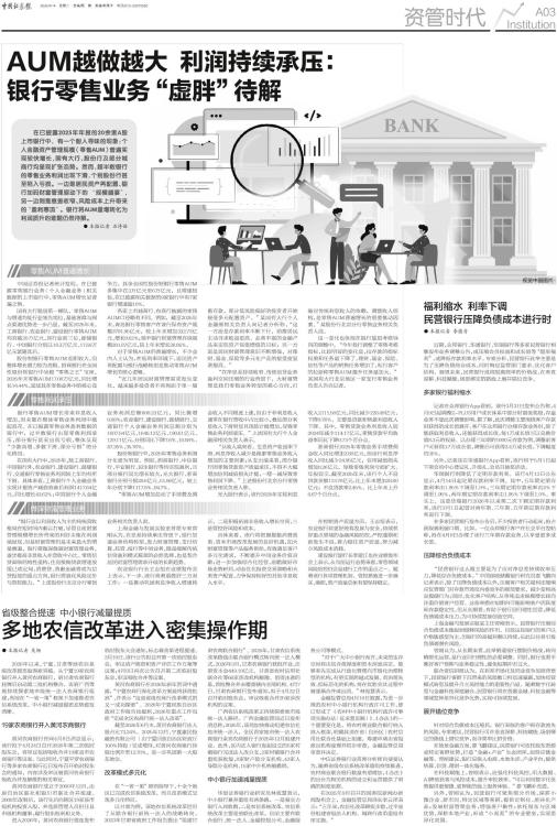 在已披露2025年年报的20余家A股上市银行中,有一个耐人寻味的现象:个人金融资产管理规模(零售AUM)普遍实现较快增长,国有大行、股份行及部分城商行均呈现扩张态势。然而,超半数银行的零售业务利润出现下滑,个别股份行甚至陷入亏损。一边是居民资产再配置、银行加码财富管理驱动下的“规模盛宴”,另一边则是息差收窄、风险成本上升带来的“盈利寒流”。银行将AUM量增转化为利润质升的难题仍然待解。 ● 本报记者 石诗语 零售AUM普遍增长 中国证券报记者统计发现,在已披露零售银行业务(个人金融业务)相关数据的上市银行中,零售AUM增长呈普遍之势。 国有大行稳居第一梯队,零售AUM与增速均处行业领先地位,基础客群与网点渠道优势进一步凸显。截至2025年末,工商银行、农业银行、建设银行零售AUM均突破20万亿元,居行业前三位,邮储银行、中国银行分别以18.3万亿元、17.58万亿元紧随其后。 股份制银行零售AUM差距较大,但整体增长潜力较为亮眼。招商银行在全国性股份制银行中坐稳“零售之王”宝座,2025年末零售AUM17.08万亿元,同比增长14.44%,延续其在零售业务中的核心竞争力,其余全国性股份制银行零售AUM多集中在3万亿元至6万亿元,且增速较快,在已披露相关数据的9家银行中有7家银行增速超10%。 各家上市城商行、农商行披露的零售AUM口径略有不同。例如,截至2025年末,青岛银行零售客户在该行保有资产规模3791.95亿元,较上年末增加332.73亿元,增长9.62%;瑞丰银行财富管理存续规模281.87亿元,较上年末增长28.85%。 对于零售AUM的普遍增长,不少业内人士认为,在低利率环境下,居民资产再配置与银行战略转型是推动零售AUM增长的核心逻辑。 “近几年居民财富管理需求发生变化,越来越多投资者不再拘泥于单一储蓄存款,部分低风险偏好的投资者开始接受多元配置资产。”某国有大行个人金融部相关负责人向记者分析称,“这一方面是存款利率不断下行,助推居民主动寻求收益更高、品类丰富的金融产品来实现资产保值增值的目标;另一方面是居民财富管理意识不断增强,对理财、基金、保险等多元化产品的接受度显著提高。” “在净息差持续收窄、传统信贷业务盈利空间压缩的行业背景下,大财富管理是我们零售业务转型的核心方向,打破对传统利息收入的依赖,调整收入结构,是零售AUM普遍增长的重要推动因素。”某股份行北京分行零售业务相关负责人说。 这一变化也体现在银行基层考核导向的调整中。“今年我行调整了零售考核指标,比较明显的变化是,拉存款的指标权重和任务量下降了,理财、基金、保险、信托等产品的销售任务增加了,私行客户的拉新和零售AUM提升任务量加大。”某国有大行北京地区一家支行零售业务负责人告诉记者。 零售利润承压 银行零售AUM增长带来非息收入增加,但未能在整体零售业务利润中激起浪花。在已披露零售业务盈利数据的银行中,过半数银行出现零售利润承压,部分银行甚至出现亏损,整体呈现“少数高增、多数下滑、部分亏损”的分化格局。 在国有大行中,2025年,除工商银行、中国银行外,农业银行、建设银行、邮储银行、交通银行零售业务利润较上年均有所下滑。具体来看,工商银行个人金融业务实现计提资产减值准备后利润1417.64亿元,同比增长43.62%;中国银行个人金融业务利润总额808.23亿元,同比微增0.08%;农业银行、建设银行、邮储银行、交通银行个人金融业务利润总额分别为1607.54亿元、1546.12亿元、190.61亿元、129.11亿元,分别同比下降7.6%、10.88%、47.35%、35.76%。 股份制银行中,2025年零售业务利润分化更为明显。例如,招商银行、中信银行、平安银行、民生银行等均实现盈利,且部分银行同比增长较大,光大银行、浙商银行分别亏损28.6亿元、51.86亿元,较上年分别下降1117.8%、94.7%。 “零售AUM增加拉动了手续费及佣金收入不同程度上涨,但由于非利息收入通常在银行营收中占比较小,叠加部分利息收入下滑明显且风险计提增加,导致零售业务利润承压。”上述国有大行个人金融部相关负责人表示。 “从收入端来看,生息资产收益率下滑、利息净收入减少是拖累零售业务收入增加的主要因素;从支出端来看,部分银行因零售贷款资产质量承压,不得不大幅增加信用减值损失计提,一增一减导致零售利润下降。”上述股份行北京分行零售业务相关负责人称。 光大银行表示,该行2025年实现利息收入2111.58亿元,同比减少228.49亿元,下降9.76%,主要是贷款和垫款利息收入下降。其中,零售贷款业务利息收入较2024年减少114.17亿元,零售贷款平均收益率同比下降0.73个百分点。 浙商银行2025年零售业务手续费佣金收入同比增加2.88亿元,但该行利息净收入同比减少24.95亿元,信用减值损失增加8.26亿元,导致零售利润亏损扩大。年报显示,截至2025年末,该行个人不良贷款余额113.78亿元,比上年末增加28.80亿元;不良贷款率2.45%,比上年末上升0.67个百分点。 做深财富管理业务 “银行业以利息收入为主的传统营收格局在短时间内难以打破,尽管目前财富管理规模增长所带来的利好未能在利润端显现,但是财富管理仍是未来最大的增量赛道,银行需做深做强财富管理业务,逐步提高非息收入在营收中占比。零售信贷面临结构性重构,住房按揭贷款增速放缓已成定局,消费贷、普惠金融将成为信贷投放的重点方向,银行需强化风险定价与