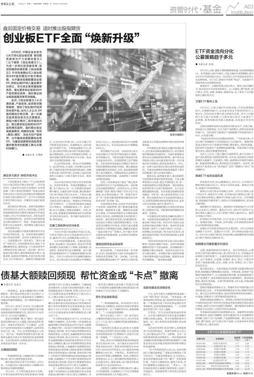 ● 本报记者 张韵 4月14日,A股、港股主要指数集体收涨,创业板指涨超2%。全市场超九成ETF收红,卫星主题ETF强势霸榜,成为当天ETF市场的最大亮点。与此同时,ETF市场资金流向分化态势持续。4月13日,债券ETF逆势“吸金”,与宽基ETF持续净流出形成鲜明反差。 展望后市,公募机构观点较为多元,既有主张均衡防守,也有波动中寻求进攻的观点。AI、光通信、燃气轮机、国产算力、红利、消费、资源品、港股科技、化工等多个方向都受到公募机构关注。 卫星ETF集体上涨 4月14日,卫星主题ETF表现亮眼,不仅包揽涨幅前六,且涨幅均超4%。这也是目前全市场仅有的6只卫星ETF,均为2025年集中成立的新兴品种。其中,5只跟踪中证卫星产业指数,1只聚焦国证商用卫星通信产业指数,两类指数虽同属卫星赛道,但权重分布有所区别。 这两大指数的前两大权重股均为航天电子、中国卫星,但权重占比差距明显。中证卫星产业指数中,两家企业权重均超11%,国证商用卫星通信产业指数赋予的权重均低于9.5%,分布更分散。 “权重分布差异决定指数投资特性。”有机构分析,中证卫星产业指数前十大权重股合计占比超63%,能更好体现龙头带动与全产业链协同预期,弹性更大、进攻性更强。国证商用卫星通信产业指数权重偏均衡,抗波动能力可能更为突出,更适合稳健型投资者。 业内人士认为,卫星主题ETF强势背后,离不开国内卫星产业快速发展与政策持续护航。近年来,我国商业卫星发射频次大幅提升,卫星通信、导航、遥感等应用场景不断拓展。配套政策密集出台,推动资金关注度提升。2026年,商业航天产业或进入由“技术验证”迈向“规模化产业化”的关键拐点。 债券ETF成资金避风港 资金流向方面,Wind数据显示,4月13日,全市场ETF整体净流出超160亿元,资金分化特征显著。债券ETF吸金,宽基ETF持续净流出。 债券ETF成为资金布局核心品种。4月13日净流入前十的ETF中,债券ETF占9席。全市场50余只债券ETF里,仅4只出现资金净流出,整体单日净流入超17亿元。在市场震荡、风险偏好回落背景下,债券ETF凭借稳健特性,成为资金避风港。 城投债ETF表现突出,城投债ETF海富通4月13日净流入6.20亿元,居榜首。截至4月13日,该ETF已连续5个交易日净流入逾6亿元,4月以来累计净流入超40亿元,稳居全市场ETF首位。 科创债ETF同样活跃,3只产品进入单日净流入额前十。国债政金债、可转债、30年国债、10年国债等品种的ETF同样获得资金青睐。 宽基ETF仍是资金净流出的主要品种。4月13日净流出额前十ETF中,宽基ETF占7席,多只净流出均超10亿元。4月以来,挂钩沪深300、科创50等大盘指数的部分宽基ETF累计净流出均超30亿元。 短期建议均衡配置应对波动 近期,地缘局势成为市场焦点。面对外界扰动,公募机构之间的观点略有分歧,观点相对多元化。在普遍认可结构性行情的背景下,公募机构看好的细分方向较为丰富。AI产业链中,AI基建、光通信、电力、算力、下游应用等多个领域受青睐,此外,消费、红利、资源品、化工等方向也获关注。 南方基金表示,当前市场处于财报季与地缘局势交织阶段,短期建议均衡配置应对波动。中期来看,宏观景气度维持平稳的背景下,大小盘风格有望均衡。在高质量发展与AI产业周期下,成长风格的投资机会值得期待。绝对收益维度,看好红利风格。从季节性规律看,4月大盘、价值风格的历史表现更优。 景顺长城基金柯海东认为,地缘冲突对市场的最大冲击阶段或已过去,可考虑积极把握进攻方向以捕捉市场机会。重点关注全球化消费品、适应内需变革的传统消费品、AI基建、资源品中上游等领域的投资机会。 景顺长城基金金璜认为,持续流入的南向资金和看好中国科技成长资产的外国主权基金有望对港股市场形成有力承接,或助力2026年港股行情演绎。叠加港股科技板块估值处于历史低位,对其后市持乐观态度。 平安基金权益投资总监神爱前认为,地缘事件具有较高不确定性、较低可预测性。投资关键或不在于对地缘事件的判断,而在于对产业周期、产业趋势的把握。重点关注光通信、燃气轮机、国产化算力等产业链,以及油价抬升背景下的部分化工涨价品种。