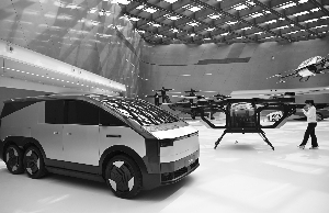 这是4月13日在广州天河区的小鹏科技园拍摄的陆地航母飞行汽车。新华社图文