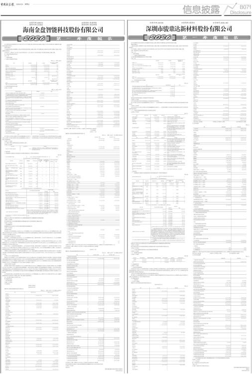 证券代码:301538 证券简称:骏鼎达 公告编号:2026-023 本公司及董事会全体成员保证信息披露的内容真实、准确、完整,没有虚假记载、误导性陈述或重大遗漏。 重要内容提示: 1.董事会及董事、高级管理人员保证季度报告的真实、准确、完整,不存在虚假记载、误导性陈述或重大遗漏,并承担个别和连带的法律责任。 2.公司负责人、主管会计工作负责人及会计机构负责人(会计主管人员)声明:保证季度报告中财务信息的真实、准确、完整。 3.第一季度财务会计报告是否经过审计 □是 √否 一、主要财务数据 (一) 主要会计数据和财务指标 公司是否需追溯调整或重述以前年度会计数据 □是 √否 ■ (二) 非经常性损益项目和金额 √适用 □不适用 单位:元 ■ 其他符合非经常性损益定义的损益项目的具体情况 □适用 √不适用 公司不存在其他符合非经常性损益定义的损益项目的具体情况。 将《公开发行证券的公司信息披露解释性公告第1号一一非经常性损益》中列举的非经常性损益项目界定为经常性损益项目的情况说明 □适用 √不适用 公司不存在将《公开发行证券的公司信息披露解释性公告第1号一一非经常性损益》中列举的非经常性损益项目界定为经常性损益的项目的情形。 (三) 主要会计数据和财务指标发生变动的情况及原因 √适用 □不适用 单位:元 ■ 二、股东信息 (一) 普通股股东总数和表决权恢复的优先股股东数量及前十名股东持股情况表 单位:股 ■ 持股5%以上股东、前10名股东及前10名无限售流通股股东参与转融通业务出借股份情况 □适用 √不适用 前10名股东及前10名无限售流通股股东因转融通出借/归还原因导致较上期发生变化 □适用 √不适用 (二) 公司优先股股东总数及前10名优先股股东持股情况表 □适用 √不适用 (三) 限售股份变动情况 √适用 □不适用 单位:股 ■ 三、其他重要事项 √适用 □不适用 一、工商变更及备案事项 2026年02月,武汉分公司完成地址变更(住所地址、经营场所、驻在地址等变更),变更后经营地址为:湖北省武汉市武汉经济技术开发区民营科技工业园二区17号厂房、3号厂房(原经营地址:武汉经济技术开发区民营科技工业园二区17号厂房),并取得当地市场监督管理部门换发的《营业执照》。 上述分公司注册地址变更,系符合分公司实际经营情况而作出。 报告期内,公司其他重要事项详见公司于报告期内在巨潮资讯网披露的所有公告和2026年03月31日披露的《2025年年度报告》之第八节财务报告之十六资产负债表日后事项。 四、季度财务报表 (一) 财务报表 1、合并资产负债表 编制单位:深圳市骏鼎达新材料股份有限公司 2026年03月31日 单位:元 ■ ■ 法定代表人:杨凤凯 主管会计工作负责人:肖睿 会计机构负责人:陈莉 2、合并利润表 单位:元 ■ 本期发生同一控制下企业合并的,被合并方在合并前实现的净利润为:0.00元,上期被合并方实现的净利润为:0.00元。 法定代表人:杨凤凯 主管会计工作负责人:肖睿 会计机构负责人:陈莉 3、合并现金流量表 单位:元 ■ (二) 2026年起首次执行新会计准则调整首次执行当年年初财务报表相关项目情况 □适用 √不适用 (三) 审计报告 第一季度财务会计报告是否经过审计 □是 √否 公司第一季度财务会计报告未经审计。 深圳市骏鼎达新材料股份有限公司 董事会 2026年04月24日