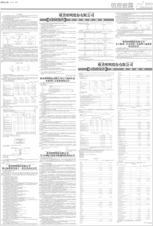 证券代码:603515 证券简称:欧普照明 欧普照明股份有限公司 本公司董事会及全体董事保证本公告内容不存在任何虚假记载、误导性陈述或者重大遗漏,并对其内容的真实性、准确性和完整性承担法律责任。 重要内容提示 (一)公司董事会及董事、高级管理人员保证季度报告内容的真实、准确、完整,不存在虚假记载、误导性陈述或重大遗漏,并承担个别和连带的法律责任。 (二)公司负责人、主管会计工作负责人及会计机构负责人(会计主管人员)保证季度报告中财务信息的真实、准确、完整。 (三)第一季度财务报表是否经审计 □是 √否 一、主要财务数据 (一)主要会计数据和财务指标 单位:元 币种:人民币 ■ (二)非经常性损益项目和金额 √适用 □不适用 单位:元 币种:人民币 ■ 对公司将《公开发行证券的公司信息披露解释性公告第1号一一非经常性损益》未列举的项目认定为非经常性损益项目且金额重大的,以及将《公开发行证券的公司信息披露解释性公告第1号一一非经常性损益》中列举的非经常性损益项目界定为经常性损益的项目,应说明原因。 □适用 √不适用 (三)主要会计数据、财务指标发生变动的情况、原因 √适用 □不适用 ■ 二、股东信息 (一)普通股股东总数和表决权恢复的优先股股东数量及前十名股东持股情况表 单位:股 ■ 注:前十名股东回购专户情况说明:截至本报告期末,欧普照明股份有限公司回购专用证券账户持有公司股份数3,224,214股,占公司总股本0.43%,未纳入上述“前10名股东持股情况”、“前10名无限售条件股东持股情况”中列示。 持股5%以上股东、前10名股东及前10名无限售流通股股东参与转融通业务出借股份情况 □适用 √不适用 前10名股东及前10名无限售流通股股东因转融通出借/归还原因导致较上期发生变化 □适用 √不适用 三、其他提醒事项 需提醒投资者关注的关于公司报告期经营情况的其他重要信息 □适用 √不适用 四、季度财务报表 (一)审计意见类型 □适用 √不适用 (二)财务报表 合并资产负债表 2026年3月31日 编制单位:欧普照明股份有限公司 单位:元 币种:人民币 审计类型:未经审计 ■ ■ 公司负责人:王耀海 主管会计工作负责人:王海燕 会计机构负责人:陶雷光 合并利润表 2026年1-3月 编制单位:欧普照明股份有限公司 单位:元 币种:人民币 审计类型:未经审计 ■ 本期发生同一控制下企业合并的,被合并方在合并前实现的净利润为:0元,上期被合并方实现的净利润为:0 元。 公司负责人:王耀海 主管会计工作负责人:王海燕 会计机构负责人:陶雷光 合并现金流量表 2026年1-3月 编制单位:欧普照明股份有限公司 单位:元 币种:人民币 审计类型:未经审计 ■ 公司负责人:王耀海 主管会计工作负责人:王海燕 会计机构负责人:陶雷光 (三)2026年起首次执行新会计准则或准则解释等涉及调整首次执行当年年初的财务报表 □适用 □不适用 特此公告 欧普照明股份有限公司董事会 2026年4月22日