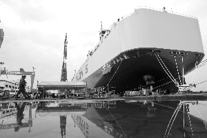 4月28日,中船广船国际联合中船贸易为韩国HMM航运建造的全球首艘10800车汽车运输船(PCTC)“格罗唯视 领航”轮在广州南沙命名交付。 该船单船最大装车量达10800辆,刷新全球同类船舶运力纪录,标志着我国高端船舶制造能力实现新突破,为全球航运业绿色低碳转型提供了“中国方案”。 图为当日一名工作人员从刚交付的运输船旁走过。新华社图文
