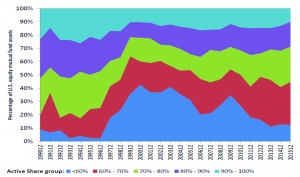 不同主动份额分组下的基金规模占比(1990-2015)