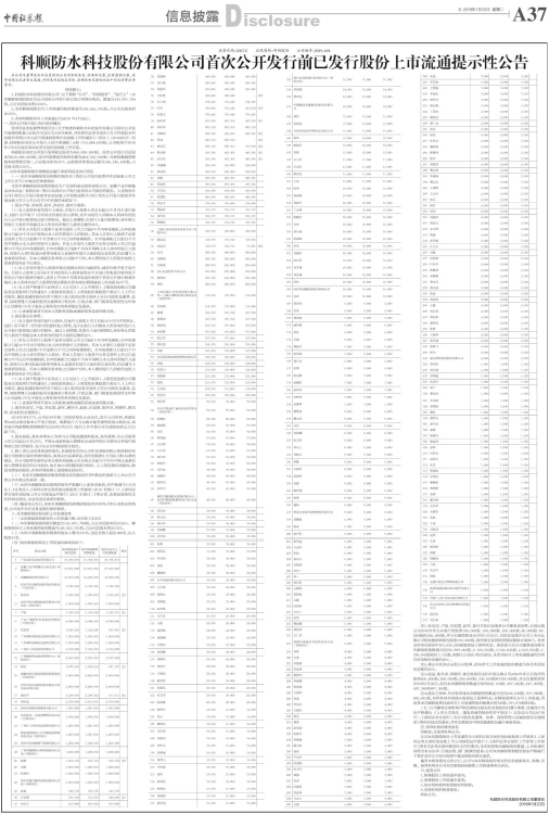 科顺防水科技股份有限公司首次公开发行前已发行股份上市流通提示性公告