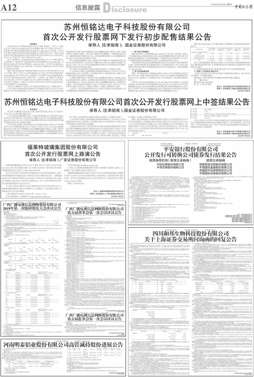 苏州恒铭达电子科技股份有限公司首次公开发行股票网上中签结果公告