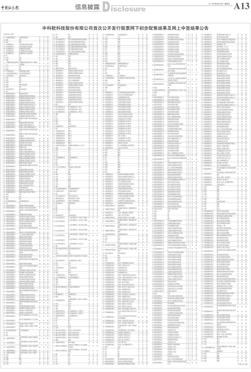 中科软科技股份有限公司首次公开发行股票网下初步配售结果及网上中签结果公告