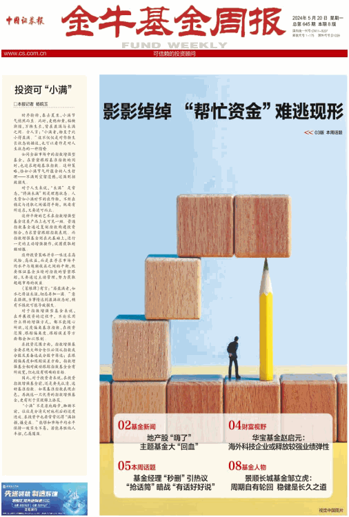 视觉中国图片地产股“嗨了” 主题基金大“回血”02基金新闻基金经理“秒删”引热议 “抢话筒”暗战“有话好好说”05本周话题04财富视野华宝基金赵启元: 海外科技企业或释放较强业绩弹性08基金人物景顺长城基金邹立虎: 周期自有轮回 稳健是长久之道