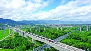 7月30日,一动车组列车行驶在杭温高铁台州市仙居县境内的线路上(无人机照片)。 当日,新建杭州至温州高速铁路的首趟试运行列车G55701次从桐庐东站出发行驶至温州北站,标志着杭温高铁进入试运行阶段。杭温高铁新建铁路线长度约260公里,是长三角城际铁路网的重要组成部分。作为国家混合所有制改革试点和社会资本投资铁路示范项目,杭温高铁开通运营对于打造“轨道上的长三角”、构建浙江省“1小时交通圈”、便捷沿线人民群众出行等方面具有重要意义。