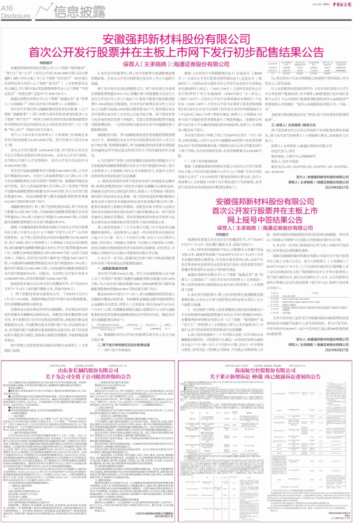 首次公开发行股票并在主板上市网下发行初步配售结果公告