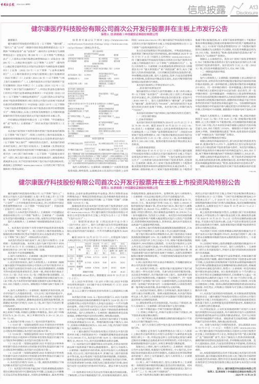 健尔康医疗科技股份有限公司首次公开发行股票并在主板上市投资风险特别公告