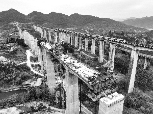 这是3月28日拍摄的渝万高铁蔡家沟双线特大桥建设现场(无人机照片)。 目前,中国铁建大桥局承建的渝万高铁蔡家沟双线特大桥建设稳步推进。 蔡家沟双线特大桥位于渝万高铁重庆市涪陵区境内,桥长2113.3米,最高主墩为150.5米,为渝万高铁全线最高墩。 渝万高铁是国家“八纵八横”高铁网包(银)海、京昆通道的组成部分。项目建成通车后,将加强渝东北三峡库区城镇群和主城都市区的便捷联系,极大地便利沿线群众出行,促进沿线经济社会发展。 新华社图文