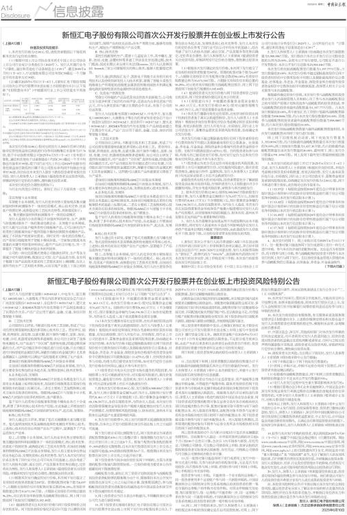 新恒汇电子股份有限公司首次公开发行股票并在创业板上市发行公告
