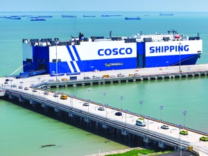9月16日,在江苏太仓港,国产汽车有序登船,装载3600余辆商品车的“玉衡先锋”号即将启程前往东南亚(无人机照片)。 近日,位于长江入海口的江苏太仓港一片繁忙,港口内的船只和货车按部就班运输、装卸货物。据江苏太仓港口管委会介绍,2025年1至8月份,太仓港完成集装箱吞吐量580万标箱,同比增长2.2%,完成货物吞吐量1.99亿吨,同比增长7.9%,其中外贸货物吞吐量完成8659万吨,同比增长11.7%,汽车、电池、光伏“新三样”出口超50万标箱,同比增长45%。 新华社记者 李博 摄